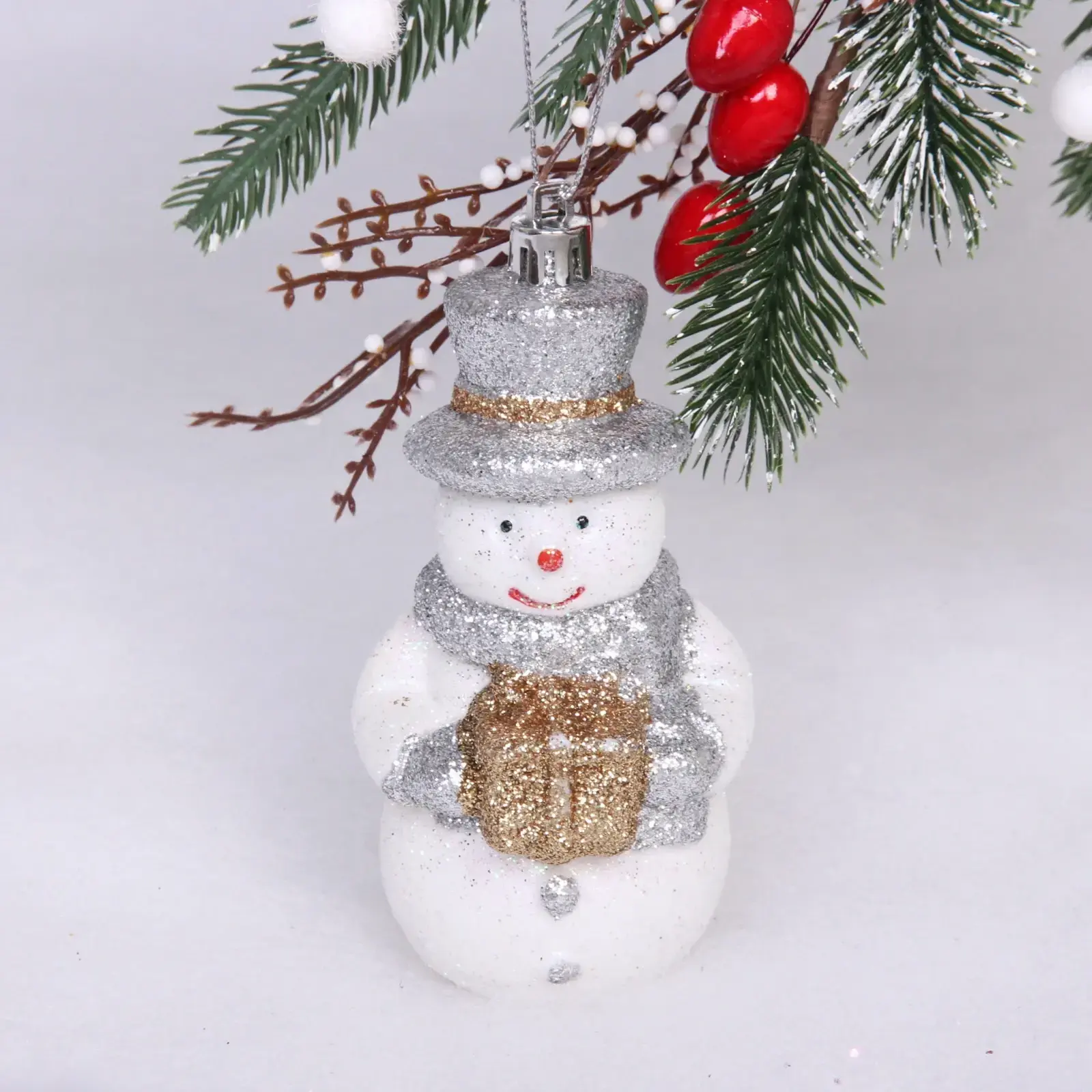 Почему стоит выбрать именно эту игрушку? Во-первых, её блестящая отделка и яркие цвета привлекают внимание и создают праздничное настроение. Во-вторых, снеговик держит в руках подарочную коробку, что добавляет элемент сюрприза и радости. Кроме того, игрушка устойчива к повреждениям и долговечна, что позволяет использовать её не один год.