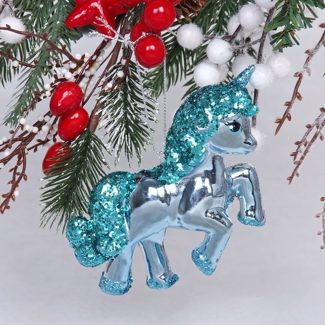 Добавьте в вашу новогоднюю елку уникальное украшение, которое привнесёт атмосферу сказки и уюта. Глянцевый металлический блеск в сочетании с нежным голубым цветом и сверкающими элементами превращает единорога в яркий акцент, притягивающий взгляды.