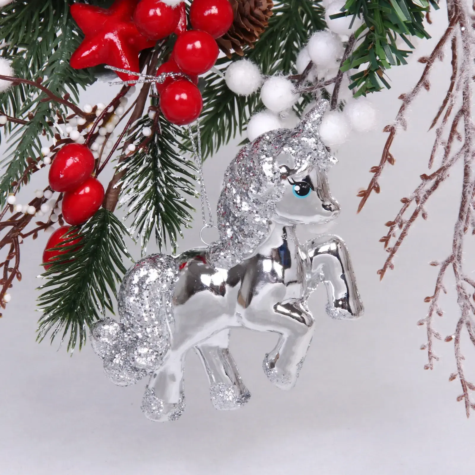Эта уникальная ёлочная игрушка в форме единорога станет настоящим украшением вашего новогоднего дерева. Выполненная в блестящем серебристом цвете, она добавит нотку магии и сказки в ваш праздничный декор. Благодаря своим компактным размерам 9х3х10 см, игрушка идеально впишется в любую композицию, создавая атмосферу уюта и радости.
