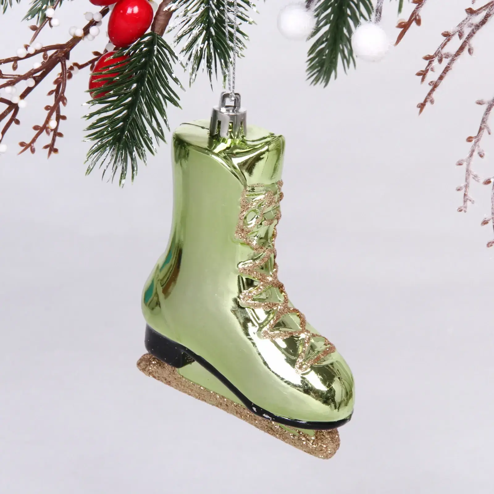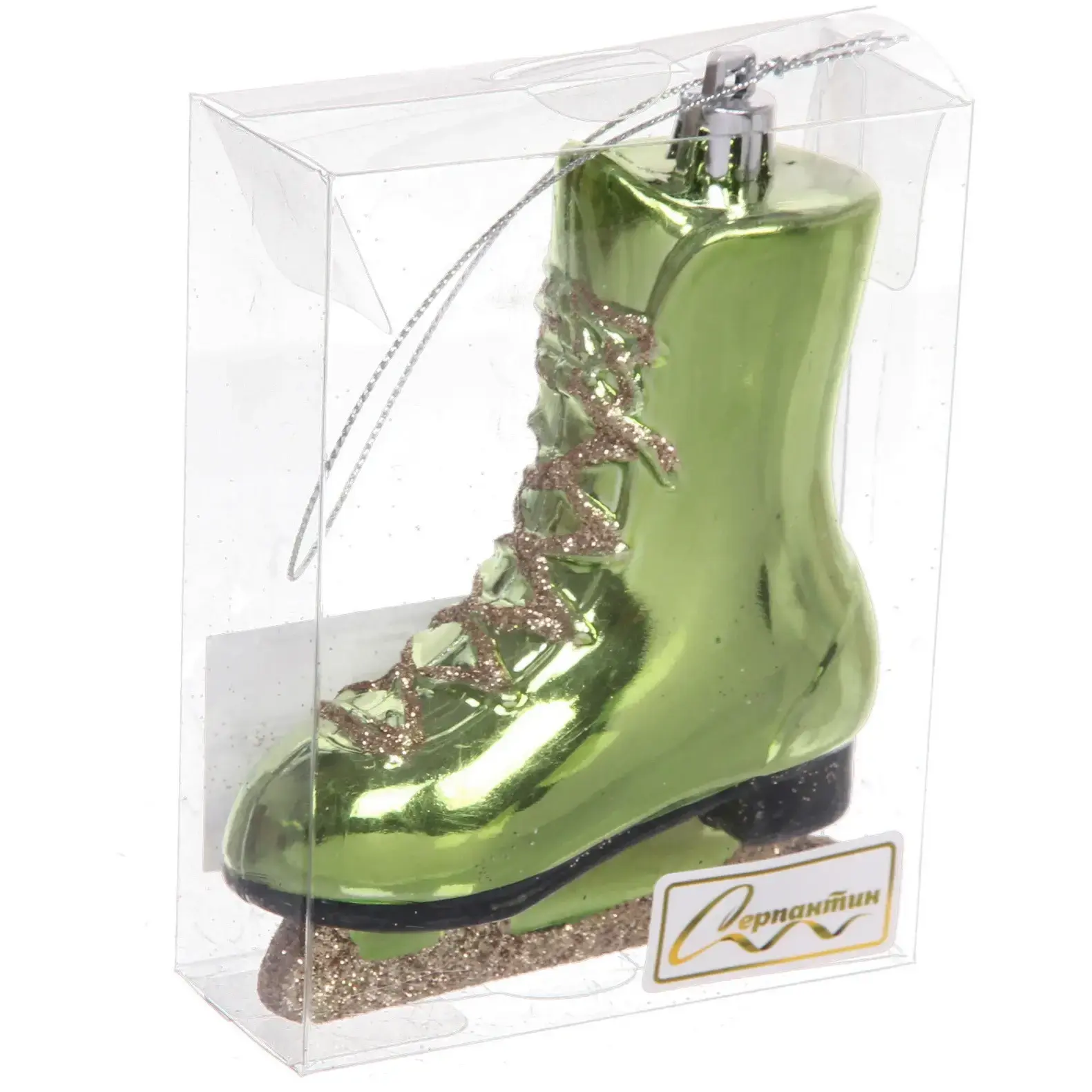Размер игрушки составляет 8,5 см в высоту, 3,5 см в ширину и 11 см в длину. Она выполнена в зелёном цвете с блестящей отделкой, что придаёт ей праздничный вид. Кончик конька оформлен в черный цвет, а подошва украшена золотистым блестящим материалом, что добавляет изысканности. «Сказочный конёк» — это не просто игрушка, а элемент, который создаст уникальную атмосферу вашего праздника.
