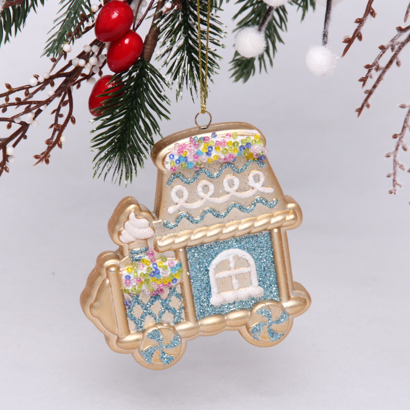 Эта уникальная ёлочная игрушка в форме поезда станет ярким акцентом вашего новогоднего декора. Выполненная в нежных голубых тонах с золотистыми и белыми элементами, она добавит нотку сказки и уюта в ваш дом. Праздничный декор, который не только украсит ёлку, но и создаст атмосферу волшебства для всей семьи.