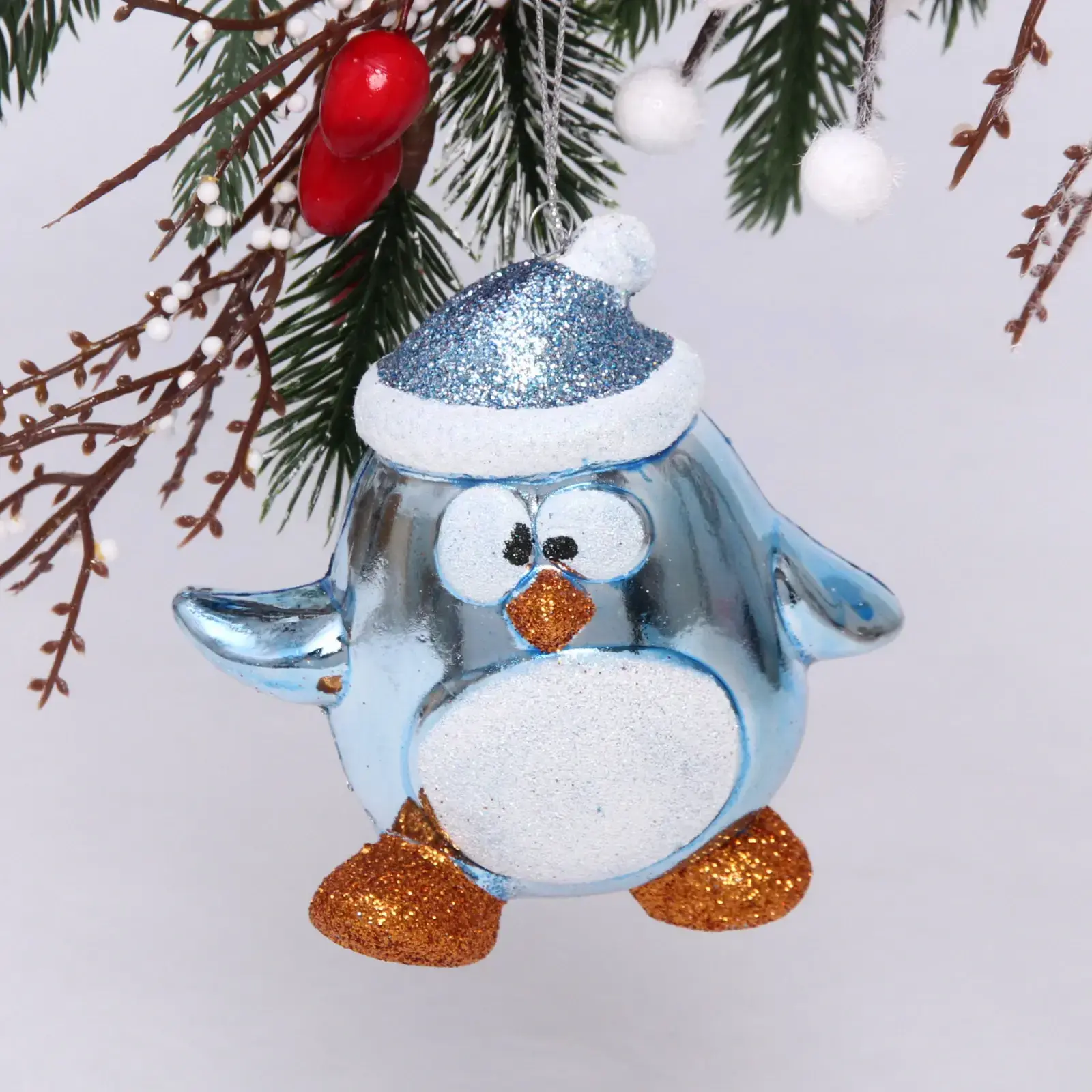 Эта игрушка выделяется своим качественным исполнением и ярким дизайном. Пингвин украшен белой шапочкой с блестками и оранжевыми ножками, что делает его ещё более привлекательным. Благодаря гладкой поверхности и блестящим элементам, игрушка будет прекрасно смотреться на ёлке, отражая свет и создавая волшебную атмосферу.