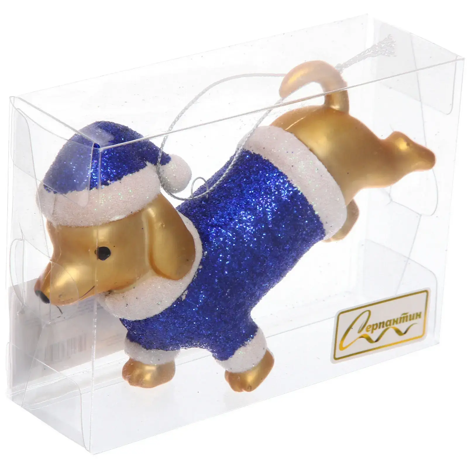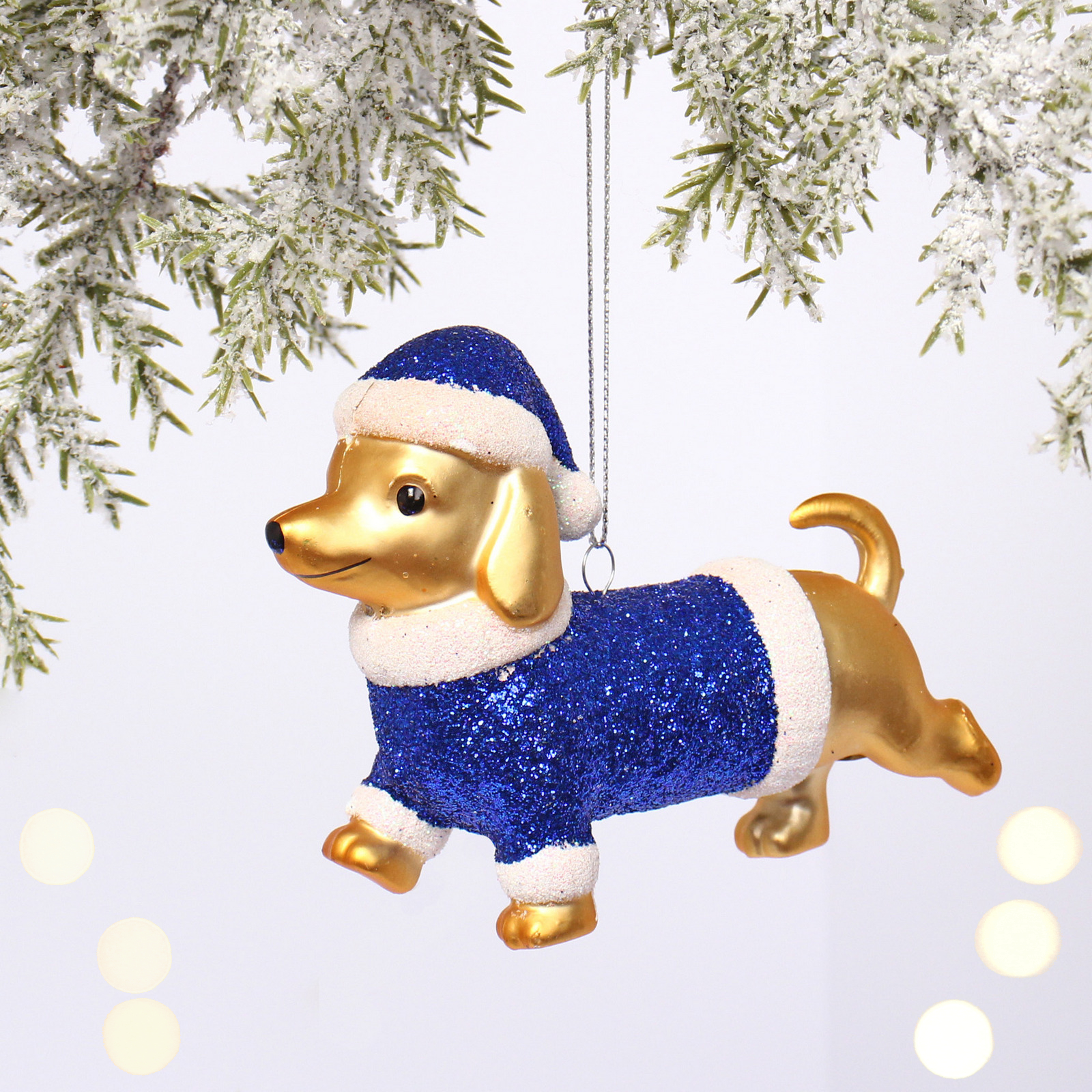 Подарите себе и близким волшебный момент каждый раз, когда на ёлке появляется эта очаровательная собачка‑декор. Сочный синий костюм в сочетании с золотистыми деталями создает яркий акцент, который притягивает взгляды и дарит праздничное настроение.