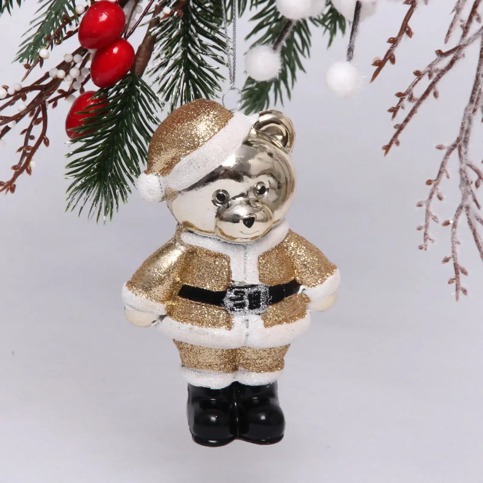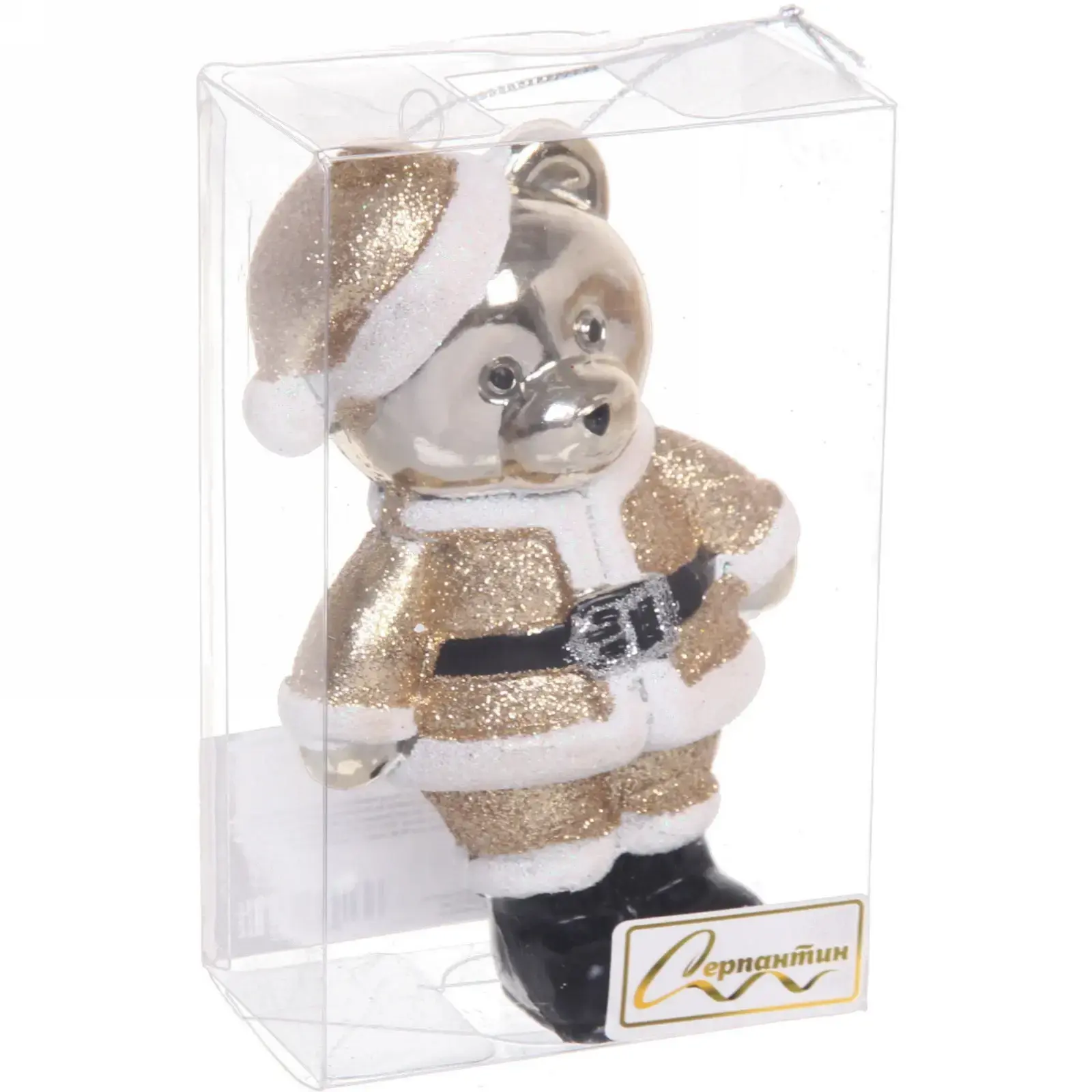 Эта уникальная ёлочная игрушка станет ярким акцентом вашего новогоднего декора. Выполненная в нежном шампань цвете с блестящей отделкой, она привнесет в ваш дом атмосферу уюта и праздника. Медвежонок, одетый в костюм Санта-Клауса, с белыми манжетами и черным поясом, станет любимым украшением для детей и взрослых.