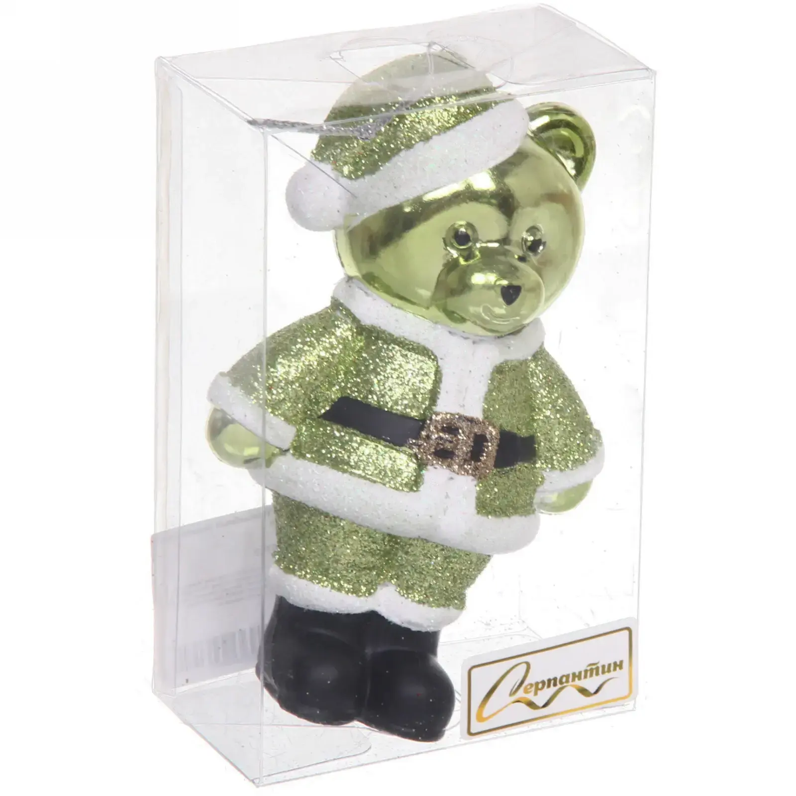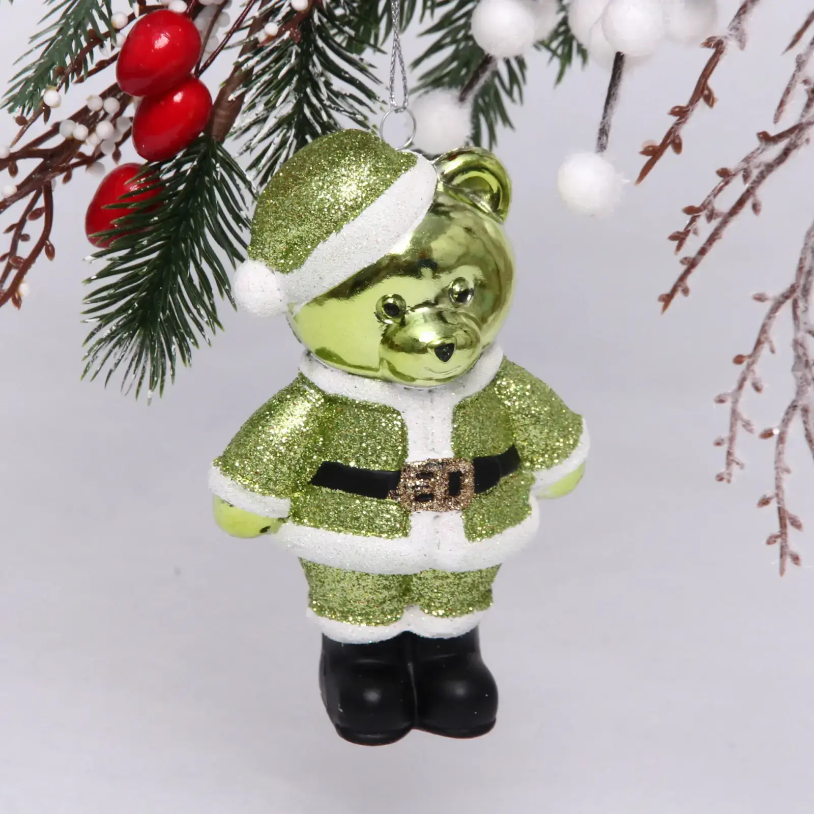 Игрушка выполнена в виде медвежонка, одетого в костюм Санта-Клауса, и имеет блестящую зелёную окраску с белыми деталями. Она подвешивается на тонкой верёвочке, что позволяет легко разместить её на ветках ёлки или в любом другом месте, где вы хотите создать праздничное настроение. Подходит для использования как в домашних условиях, так и в офисе.