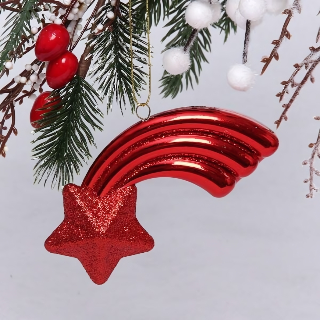 Форма сочетает изящную радугу и мерцающую звезду с глиттерным покрытием золотистого оттенка подвеса. Такая комбинация ассоциируется с чудом, исполнением желаний и приятными воспоминаниями детства. Игрушка станет гармоничным элементом как традиционного, так и современного новогоднего убранства.