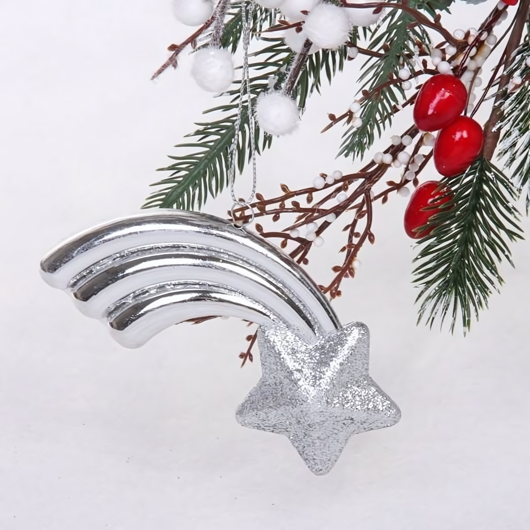 Создайте неповторимую атмосферу Нового года с изящной игрушкой в виде серебристой звезды, дополненной тремя дугами, переливающимися на свету. Это украшение притягивает взгляды и становится центральным акцентом на новогодней ели. Глянцевая поверхность и блёстки играют при любом освещении, добавляя ёлке торжественности и глубины.