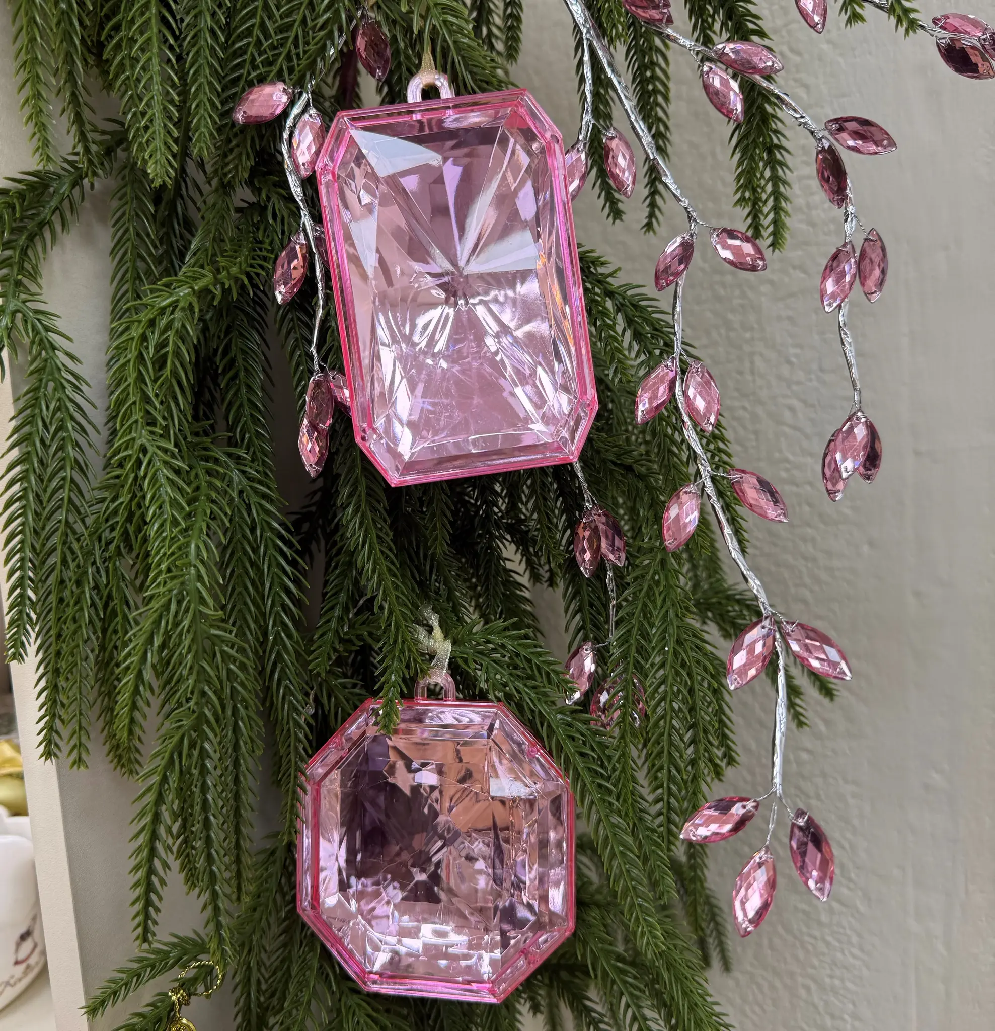 Украшение в виде крупного гранёного кристалла в изысканном розовом цвете добавит вашей новогодней ёлке утончённости и яркого акцента. Прозрачная фактура с глубокими фасетками отражает свет гирлянд, создавая объемное сияние и атмосферу настоящего зимнего праздника.