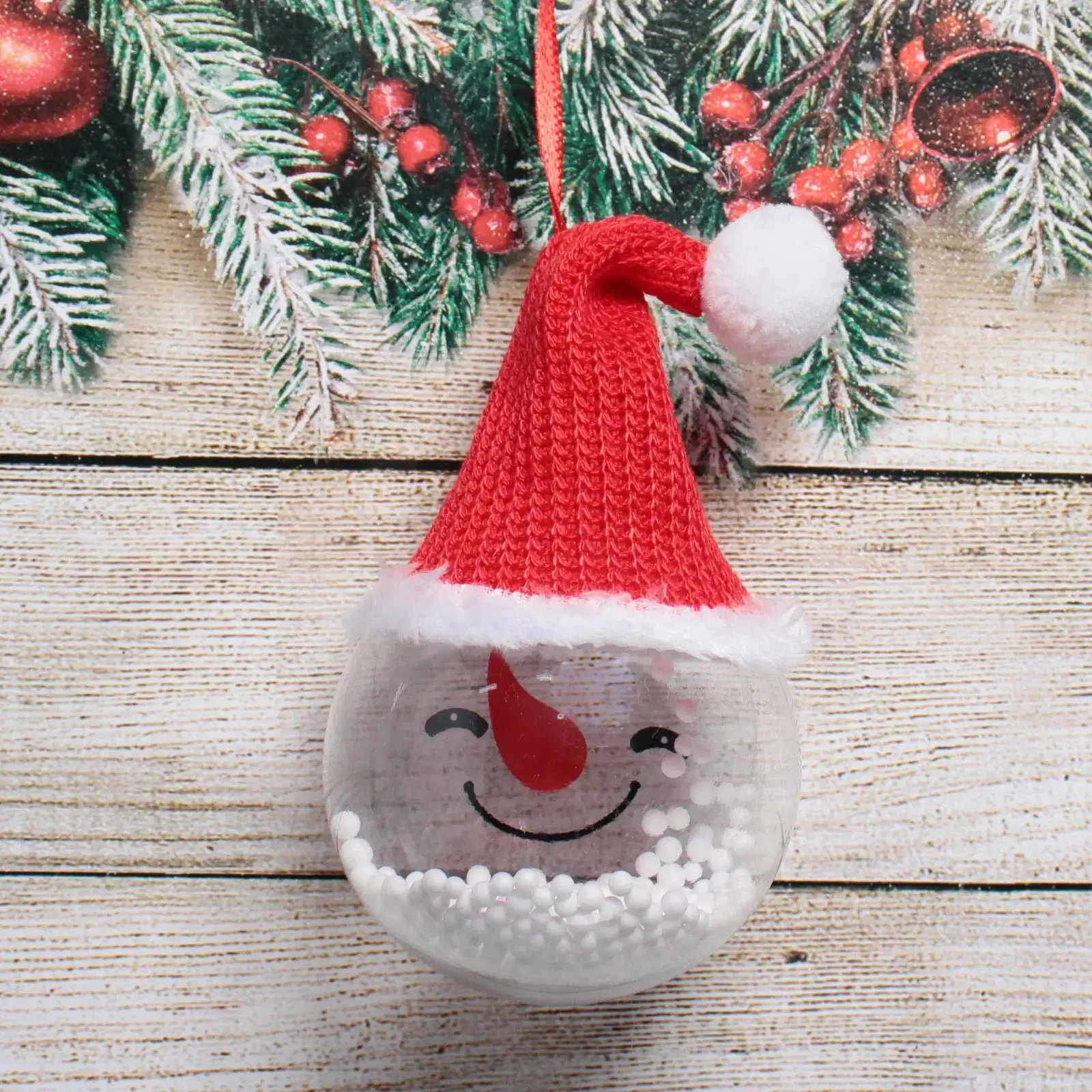 Изготовленное из качественного пластика и текстиля, украшение отличается долговечностью и практичностью. Прозрачное пластиковое тело позволяет видеть белый наполнитель внутри, создавая эффект снежного шара. Красная вязаная шапка с белым помпоном и опушкой придаёт изделию яркий и праздничный вид. Улыбающееся личико снеговика, выполненное в черном и красном цветах, добавляет игривости и радости в ваш декор.