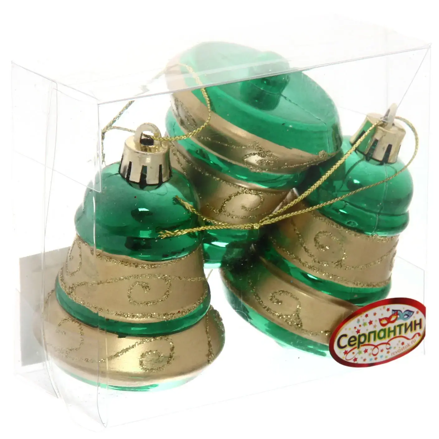 Размер каждого колокольчика составляет 6 см в высоту. Игрушки представлены в комбинации зелёного и золотого цветов, что делает их универсальными для любого новогоднего оформления. В комплекте предусмотрена удобная прозрачная коробка для хранения.