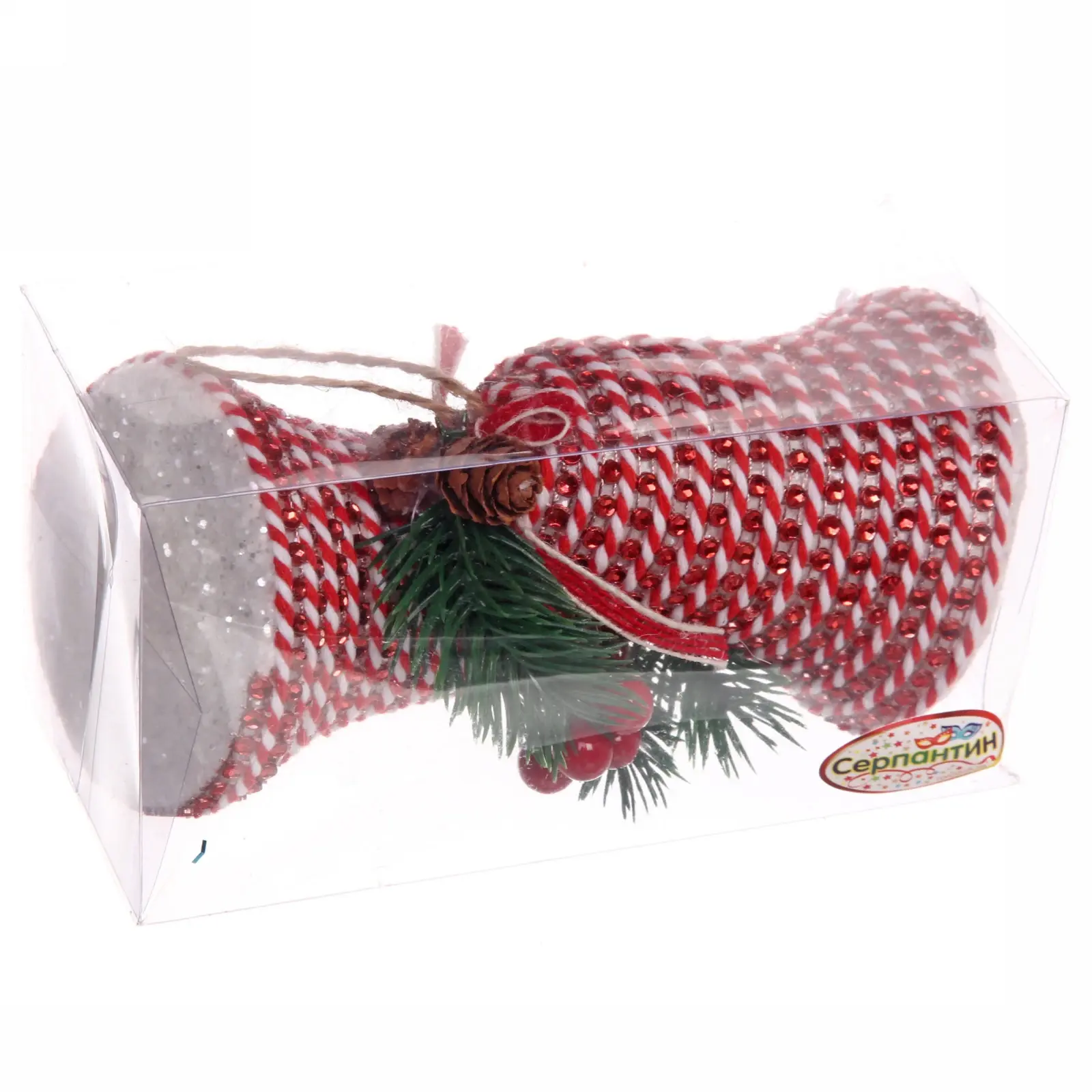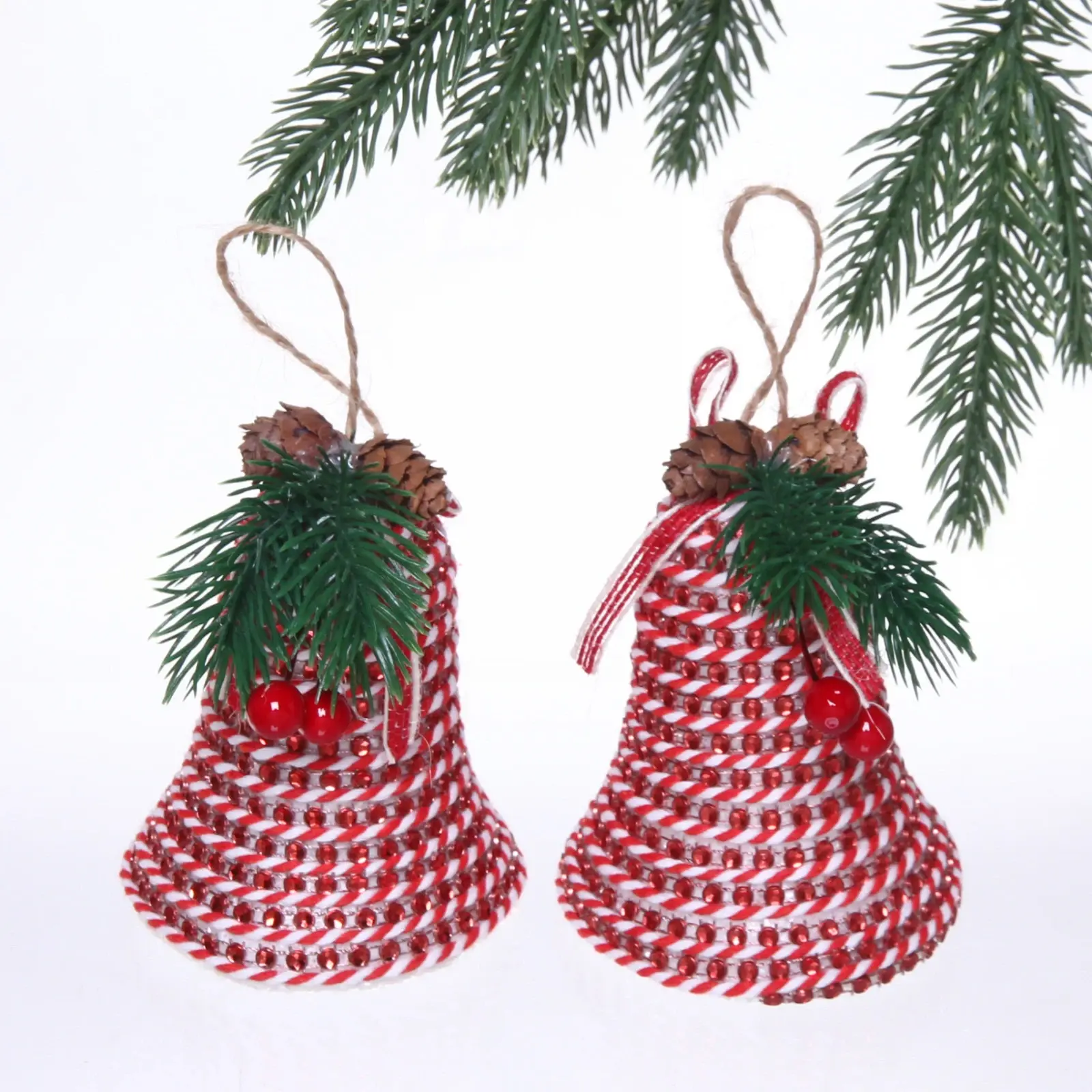 Каждый колокольчик имеет высоту 11 см и выполнен в красном цвете с белыми геометрическими узорами. Они украшены искусственными зелеными веточками, ягодами и шишками, что придаёт им натуральный вид. Упаковка из прозрачного пластика позволяет увидеть содержимое и детали украшений, что делает их отличным подарком для близких.