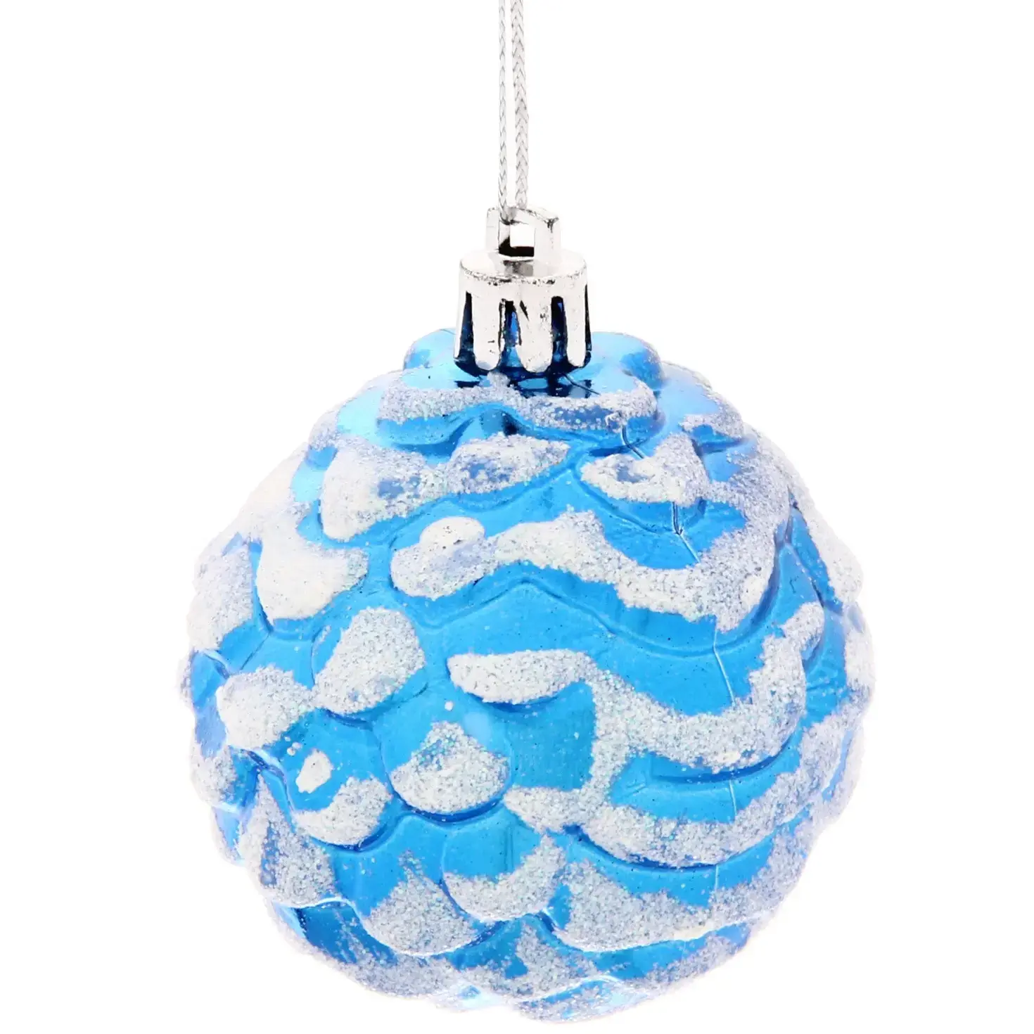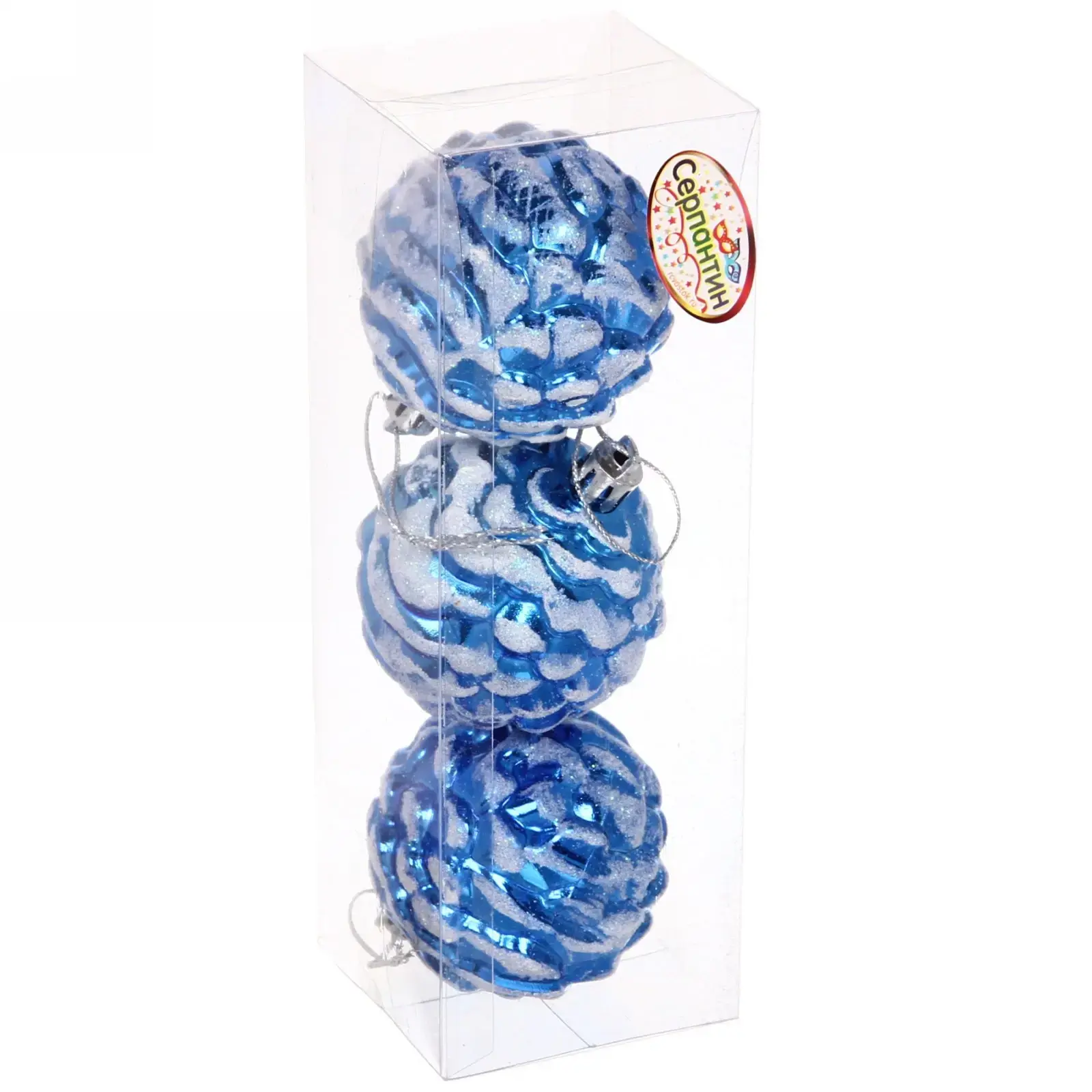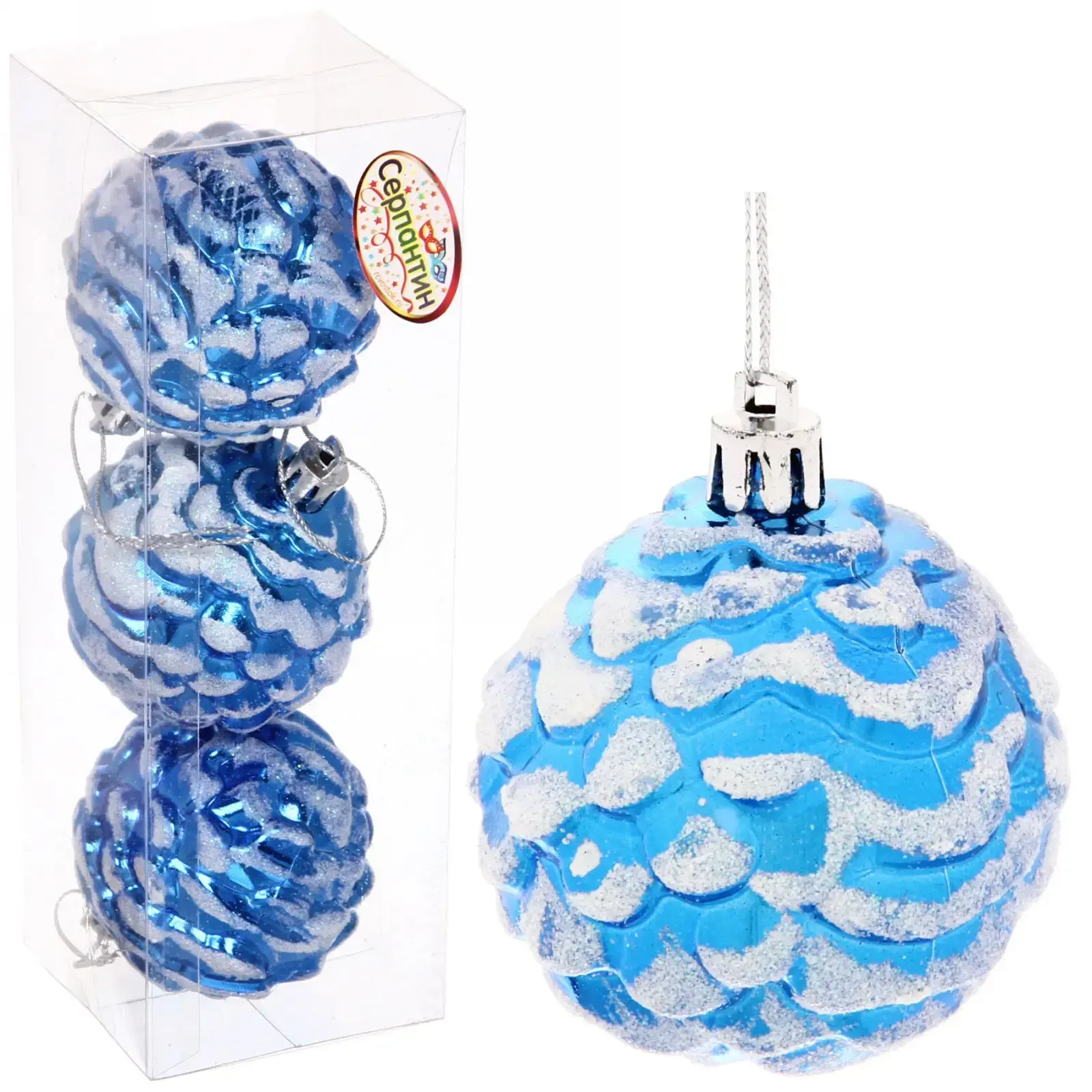 Эти великолепные ёлочные игрушки в форме шишек добавят волшебства и уюта в ваш новогодний декор. Их яркий синий цвет с белыми акцентами и блестящая поверхность создают эффект снега, что делает их идеальными для украшения ёлки. Набор из трех игрушек позволит вам легко создать гармоничное оформление, которое будет радовать глаз в течение всего праздничного сезона.