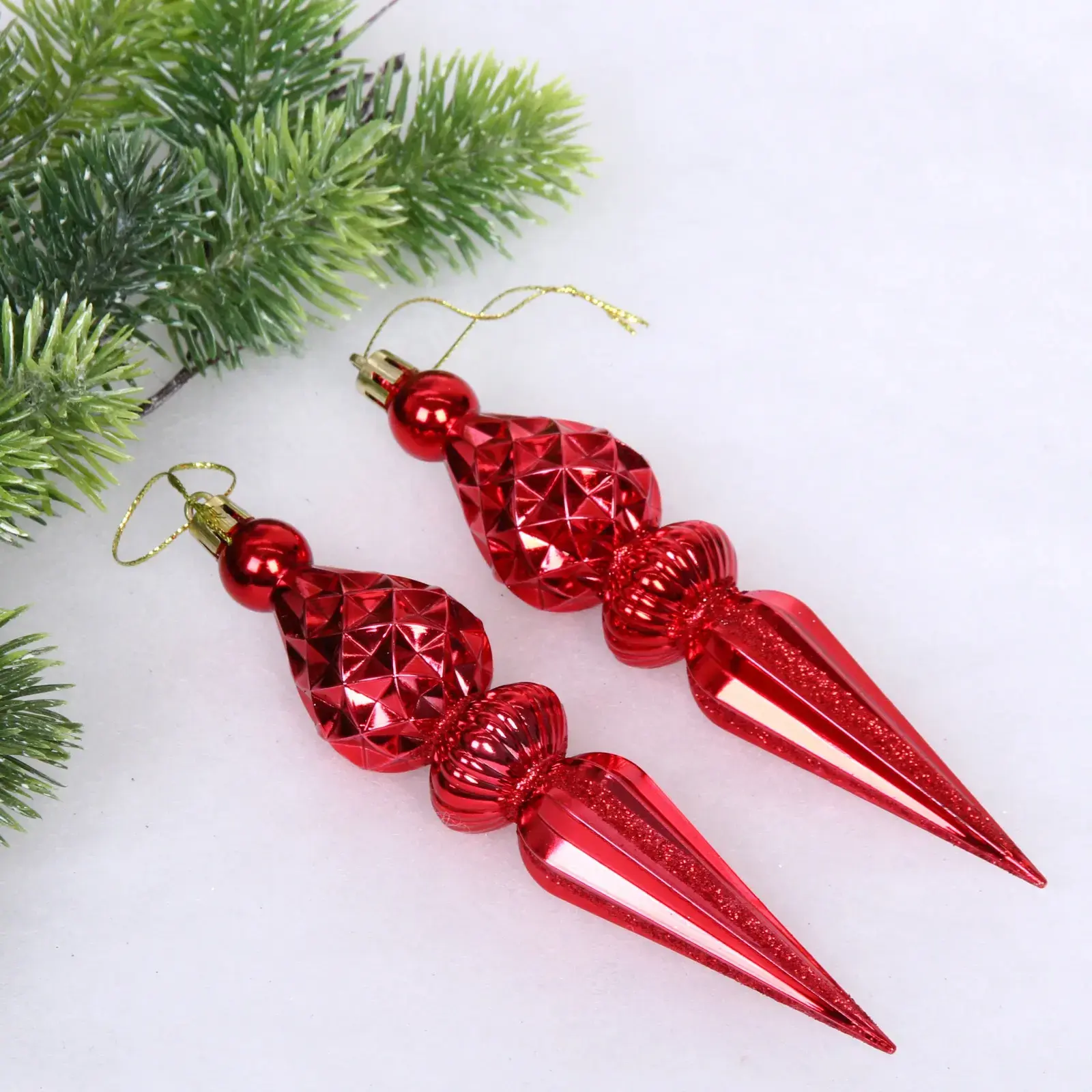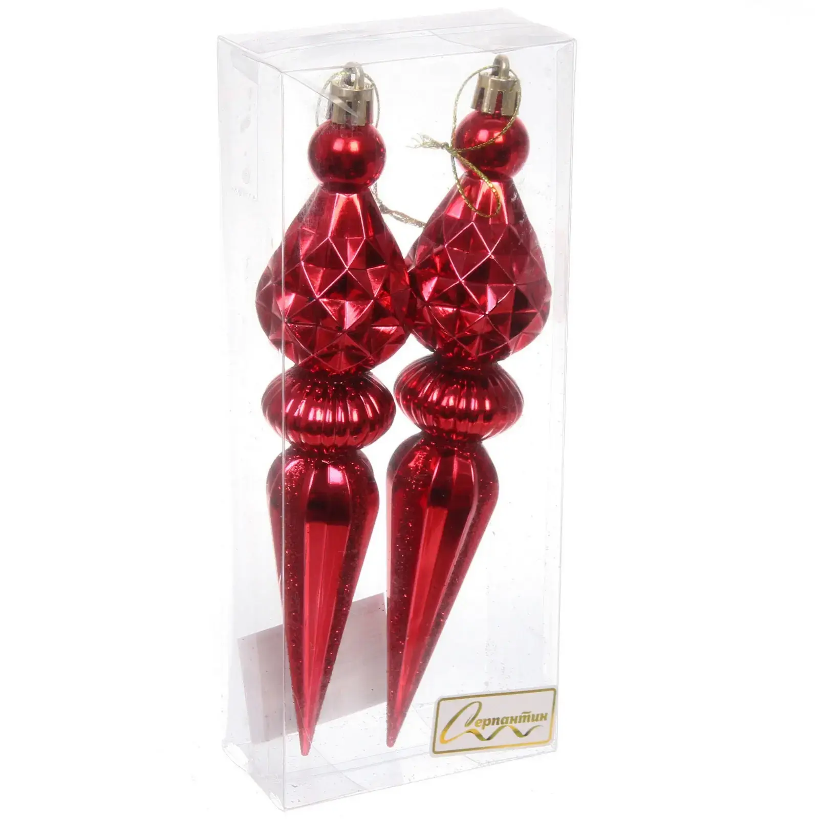 Каждая игрушка имеет уникальную форму: одна напоминает каплю, а другая — конус, что добавляет интересный визуальный эффект. Яркий красный цвет и блестящая фактура делают их идеальными для создания праздничного настроения. Упакованы в прозрачную коробку, они станут отличным подарком для ваших близких.