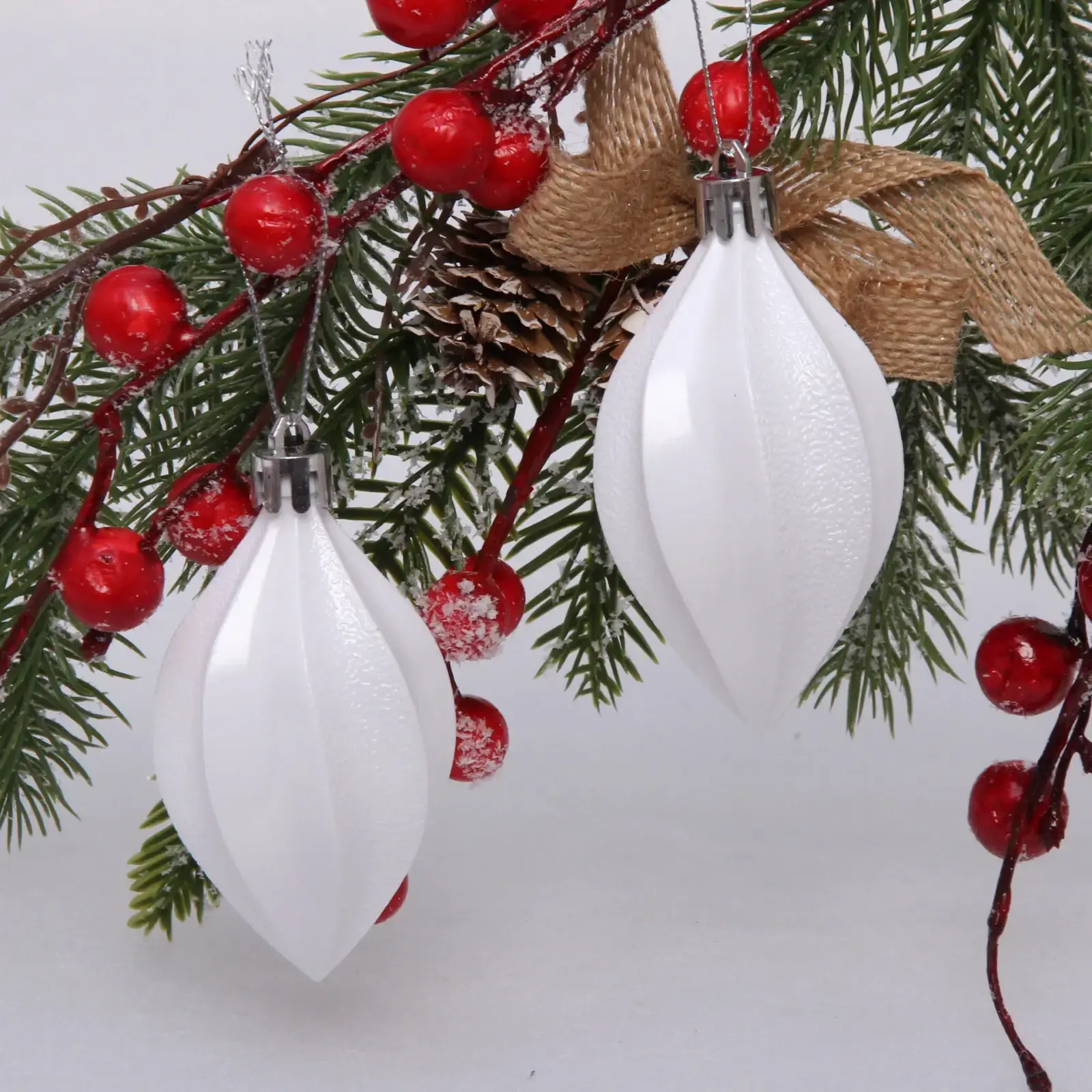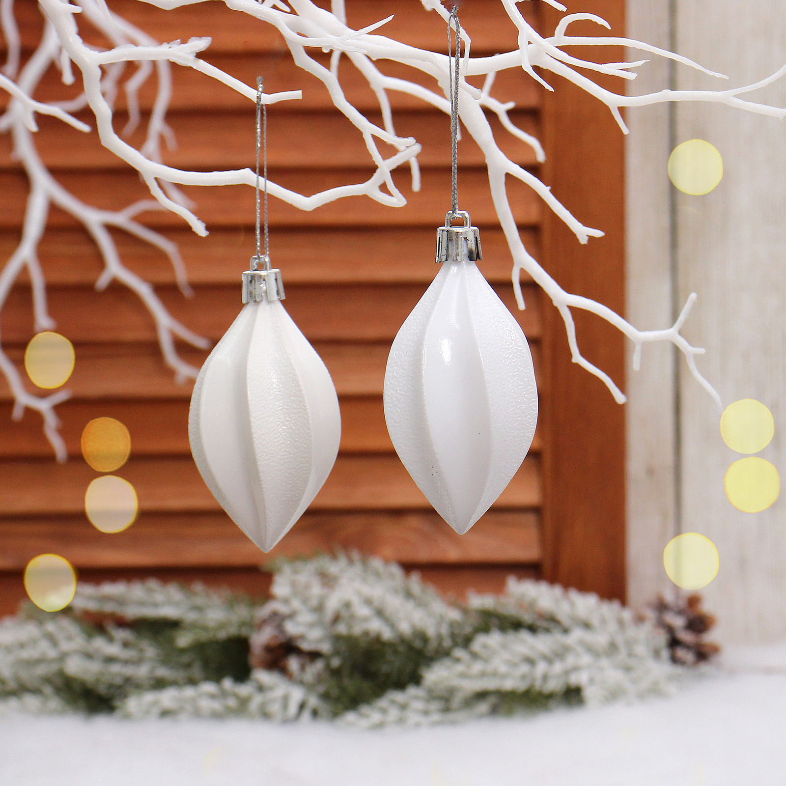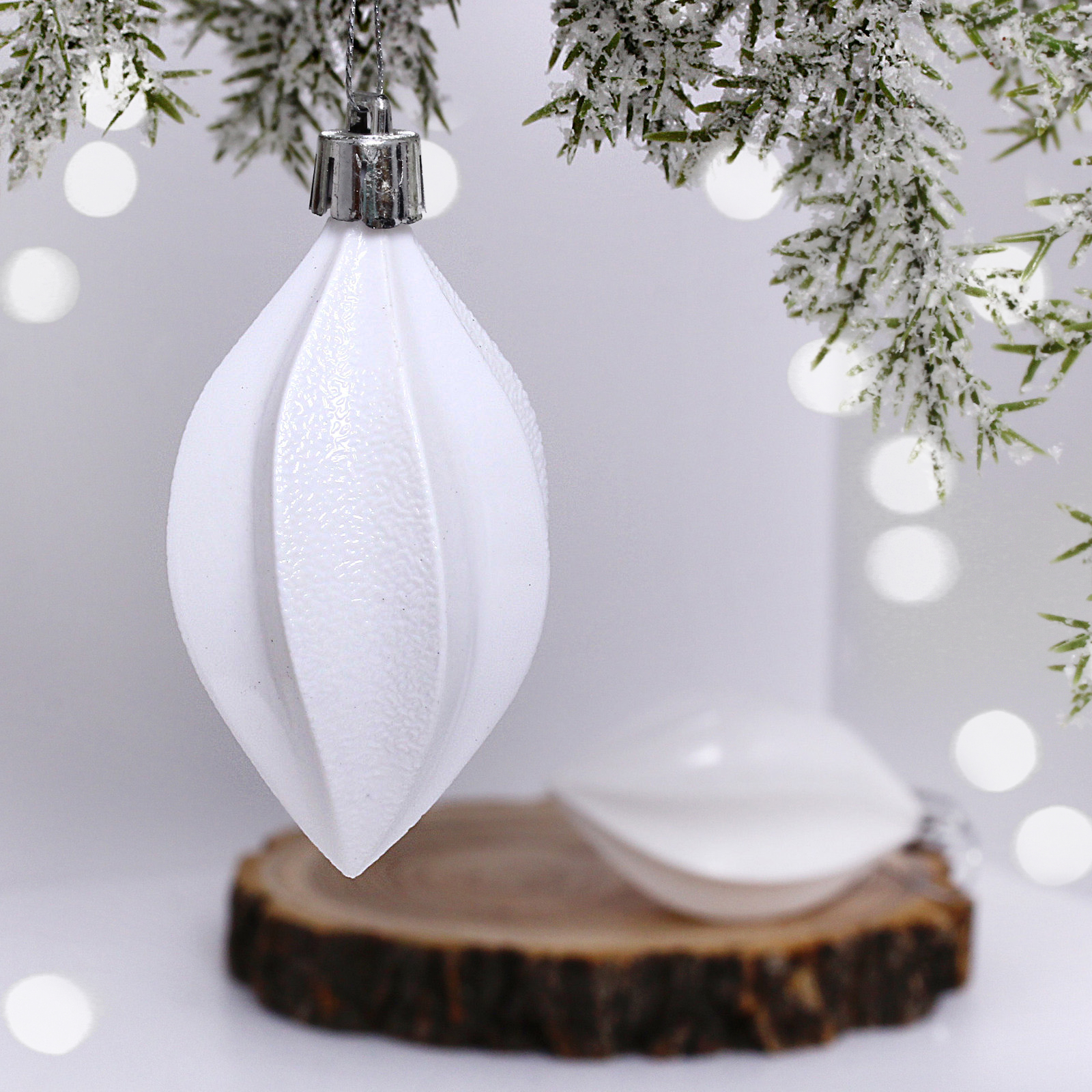 Белоснежные игрушки с тонкой текстурой поверхности создают эффект лёгкости и воздушности. Их классическая форма и нейтральный цвет позволяют комбинировать их с другими украшениями, создавая уникальные композиции.