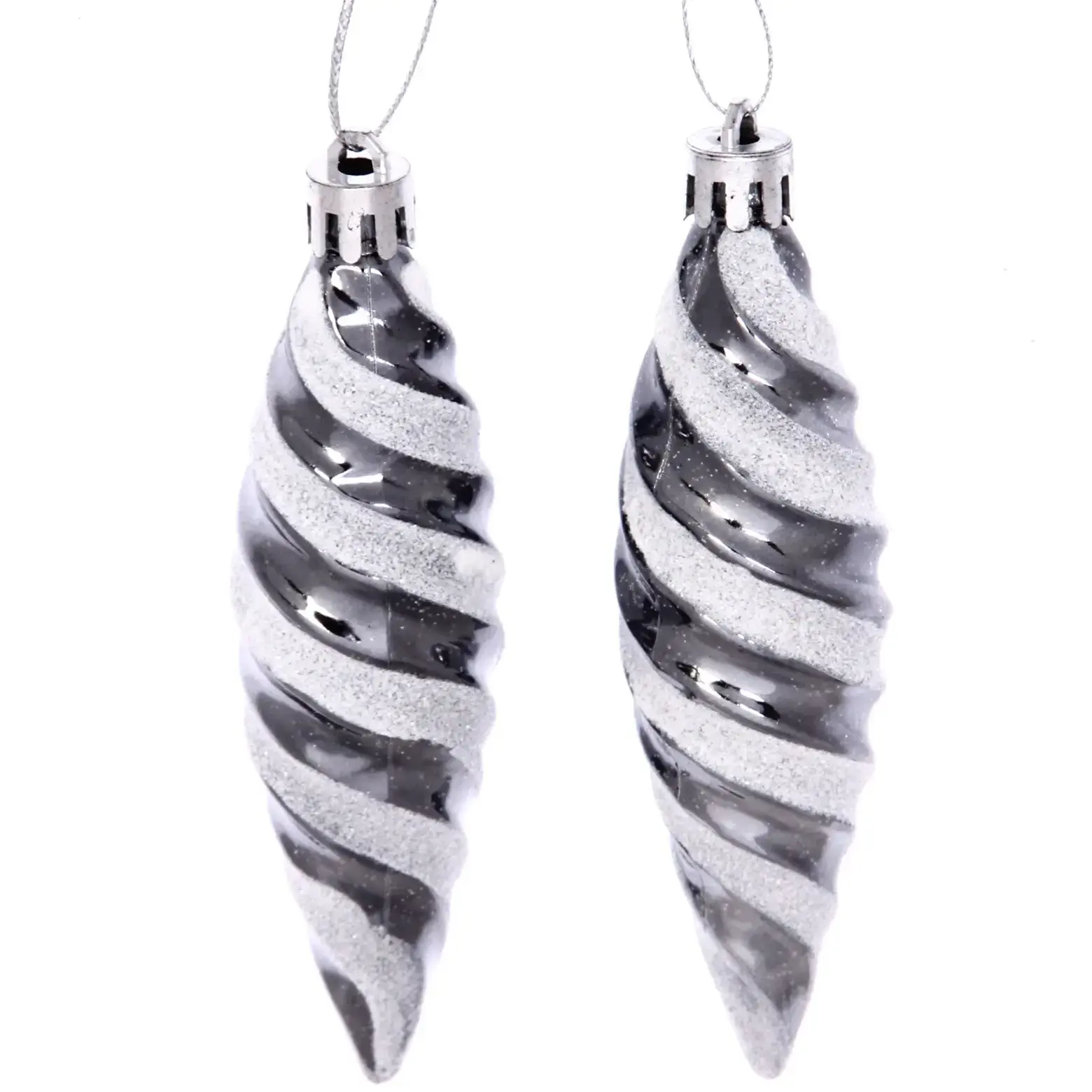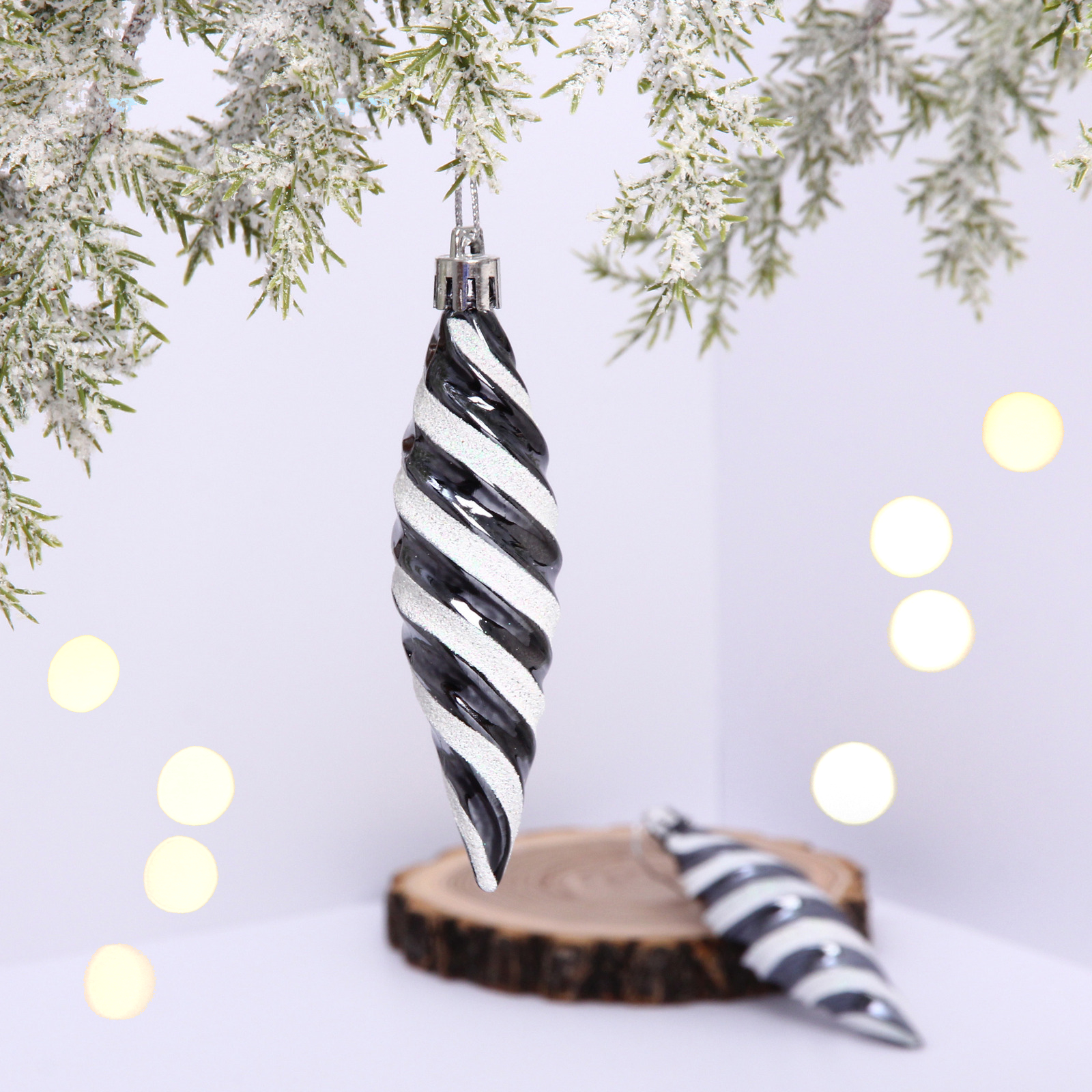 Эти ёлочные игрушки выделяются своим оригинальным дизайном и качественным исполнением. Гладкая блестящая поверхность с эффектом снега придаёт им уникальность, а графитовый цвет гармонично сочетается с другими новогодними украшениями. Они не только красивы, но и долговечны, что позволяет использовать их из года в год.