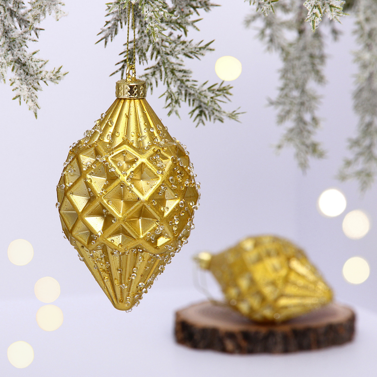 Набор из двух ёлочных игрушек "Ледяная капля" станет идеальным украшением для вашей новогодней елки. Благородный золотой цвет и изящная форма притягивают взгляды и создают ощущение волшебства.