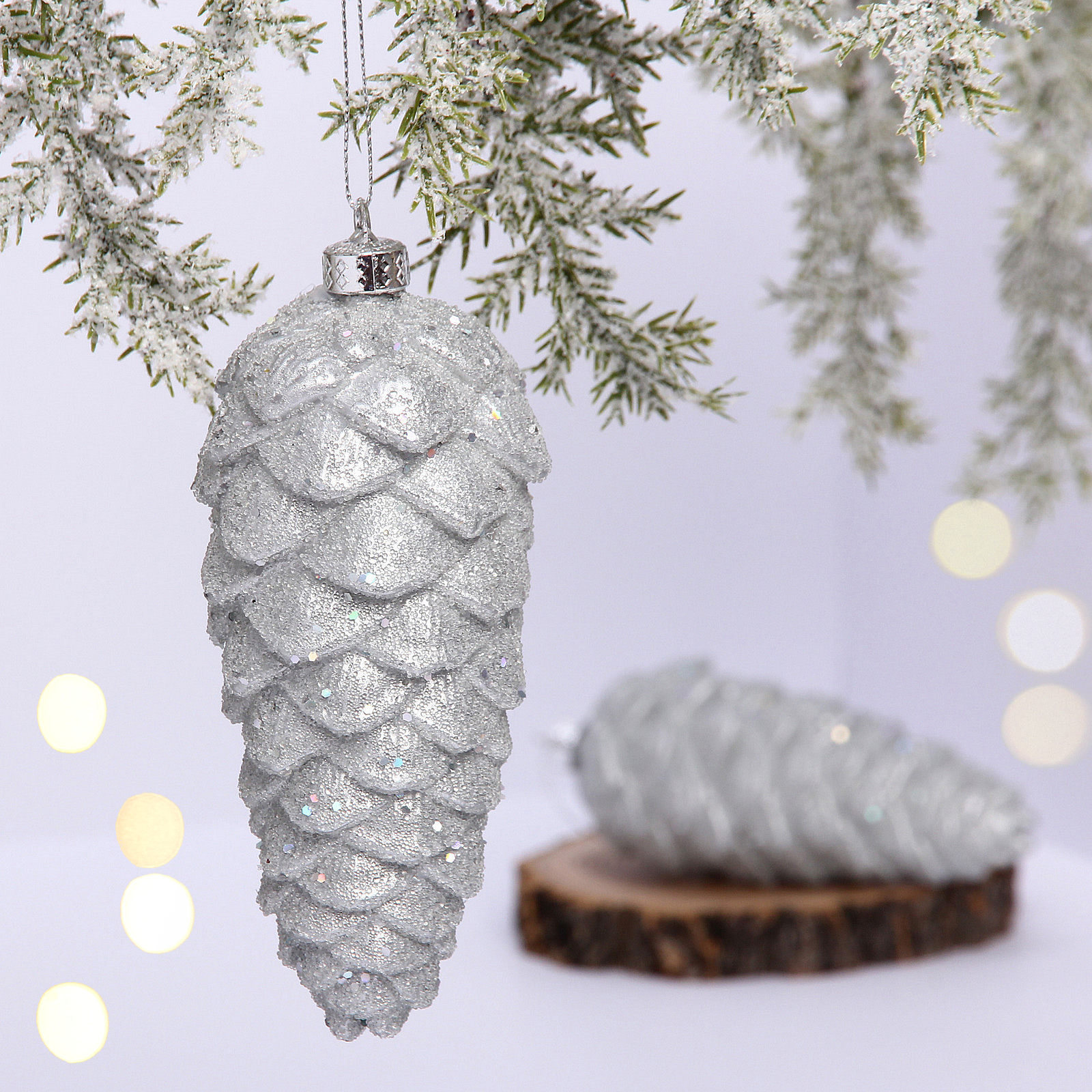 Ёлочные игрушки VERSAILLES «Снежные шишки» 14*6 см (набор 2 шт), Серебро, пластик, для елки и декорирования