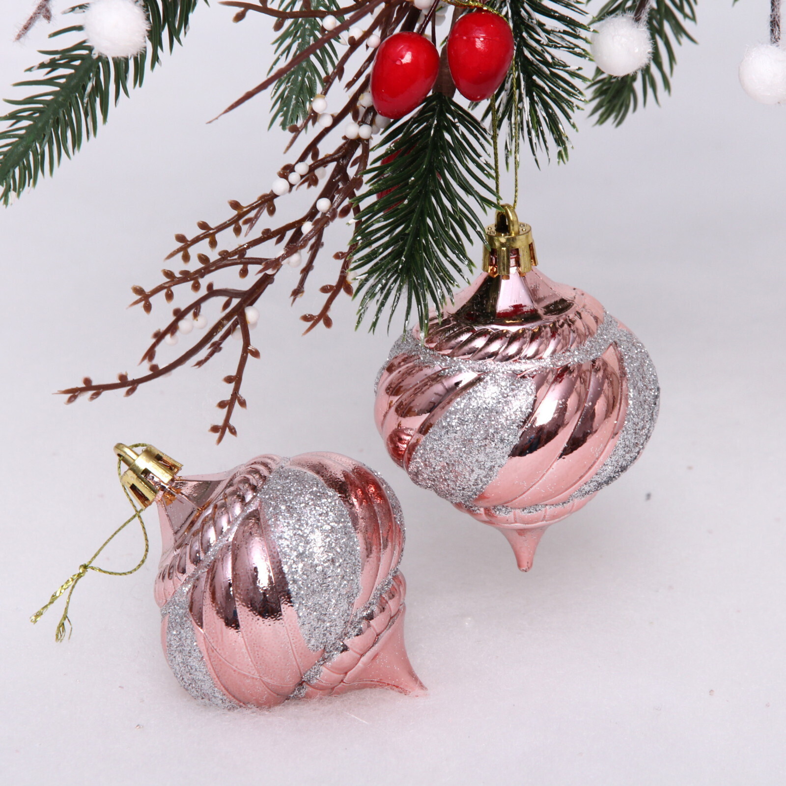 Создайте неповторимую праздничную атмосферу благодаря элегантным новогодним украшениям в благородном оттенке розового золота. Эти игрушки станут изюминкой вашего новогоднего декора.