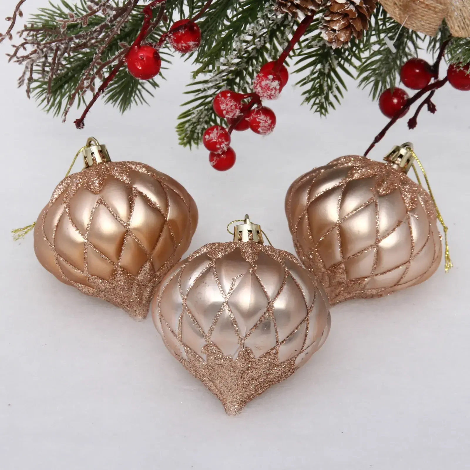 Набор из трех элегантных ёлочных игрушек «Юла» станет идеальным украшением для вашей новогодней елки. Их благородный оттенок шампань и изысканный ромбовидный узор привнесут в ваш дом тепло и уют настоящего Рождества.