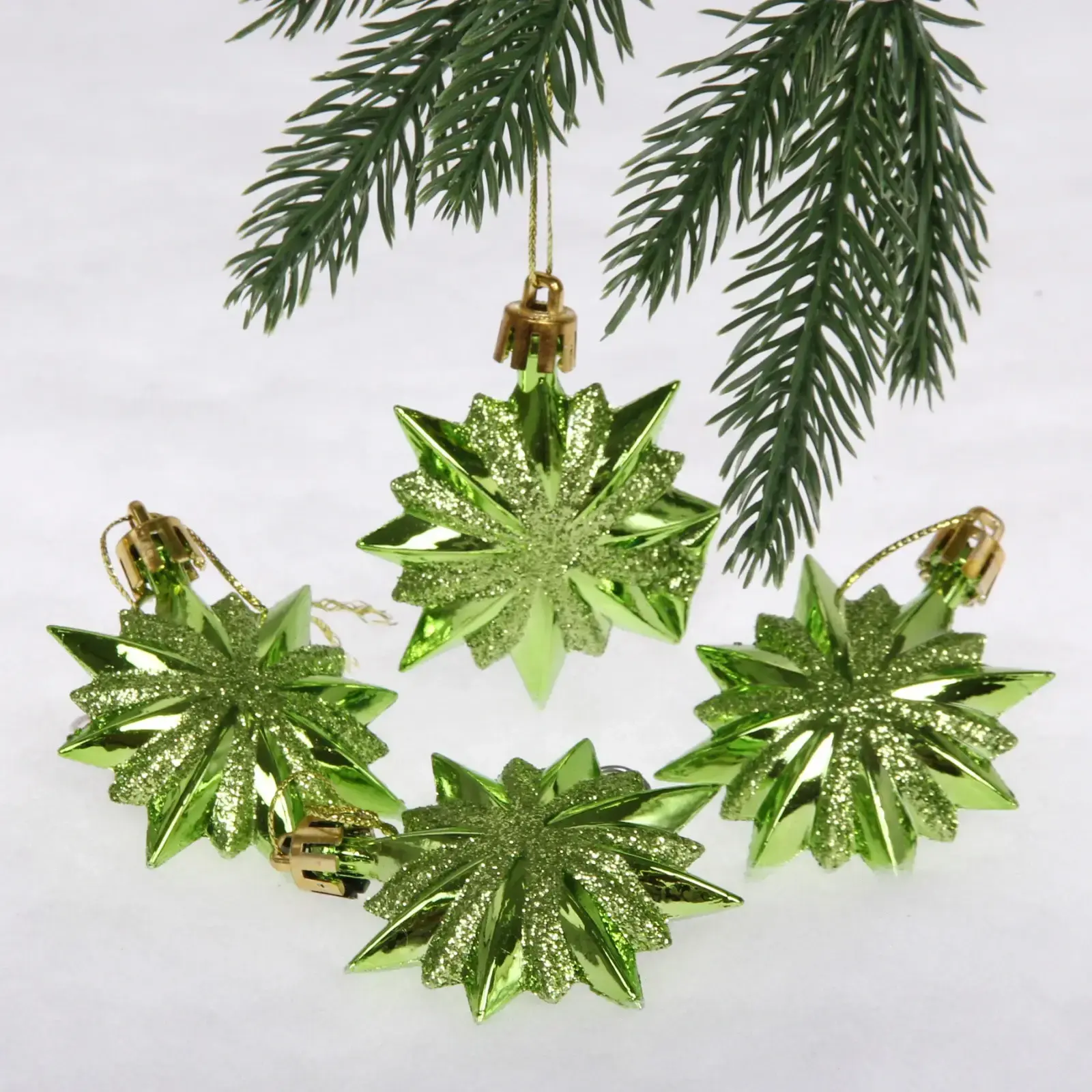 Каждая игрушка выполнена из качественного пластика, что обеспечивает долговечность и устойчивость к повреждениям. Блестящая поверхность с глиттером придаёт игрушкам особый шарм, а их форма в виде звезды с заостренными концами добавляет оригинальности. Эти украшения подойдут как для традиционных, так и для современных новогодних ёлок.