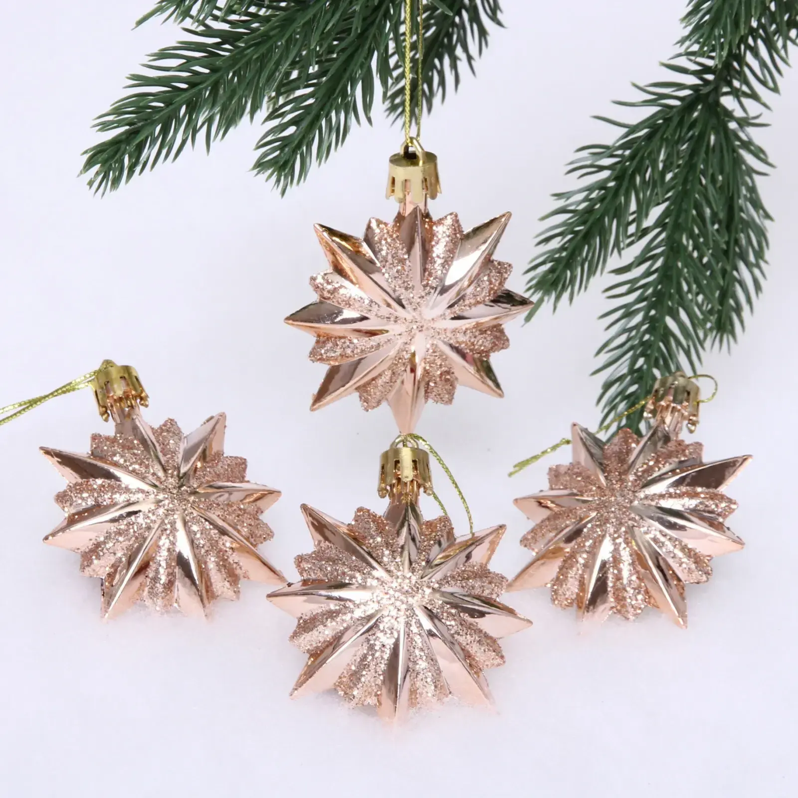 Размер каждой звезды составляет 6 см. Изготовлены из прочного пластика, устойчивого к механическим повреждениям. В комплекте 4 игрушки с золотистыми подвесками.