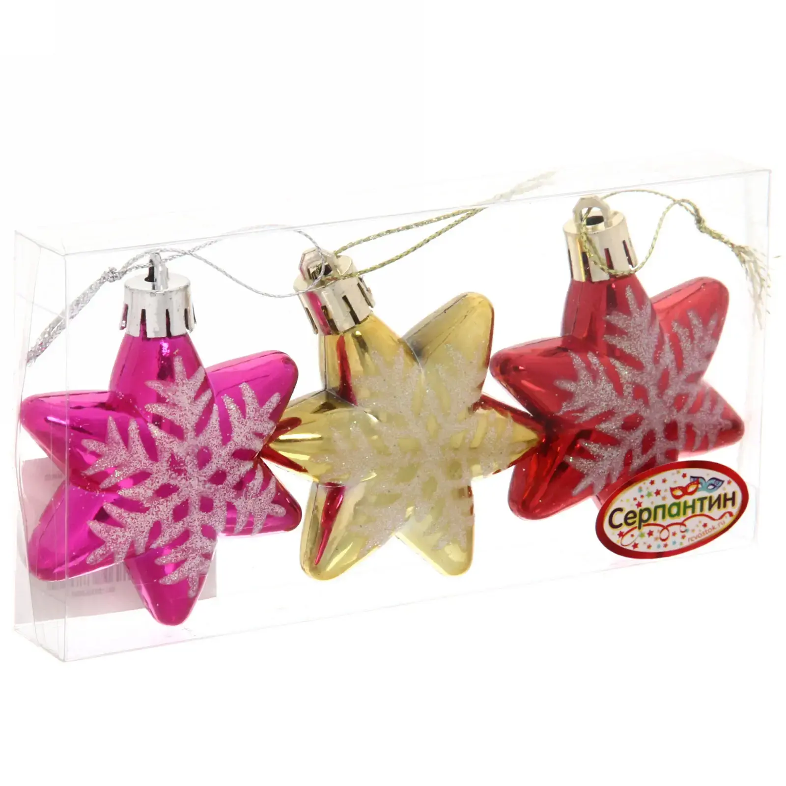 Эти яркие ёлочные игрушки в форме звездочек добавят волшебства в ваш новогодний декор. Сочетание розового, золотого и красного цветов с белыми снежинками создаст неповторимый стиль на вашей елке. Игрушки выполнены из прочного пластика, что обеспечивает их долговечность и безопасность для детей.