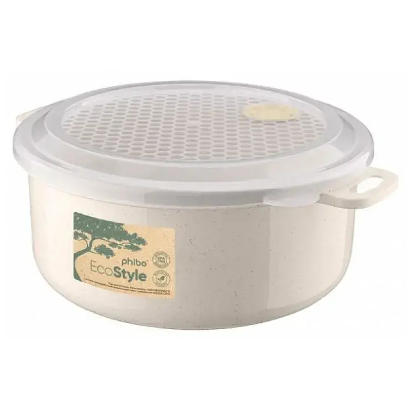 Контейнер круглый для холодильника и микроволновки, 0,9л, пластик, светло-бежевый, EcoStyle, крышка с ручками