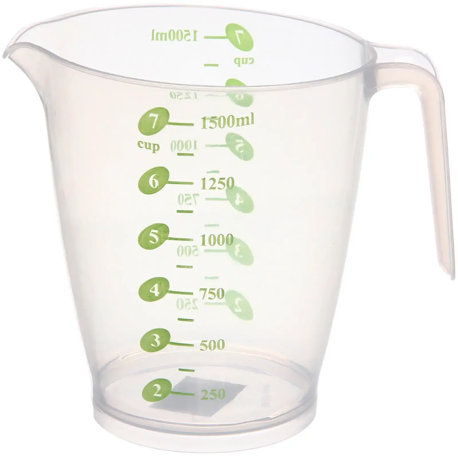 Приготовление блюд требует точности, и этот мерный стакан станет вашим надежным помощником на кухне. Прозрачный пластик с яркой зеленой шкалой позволяет легко измерять объем жидкостей до 1500 мл.