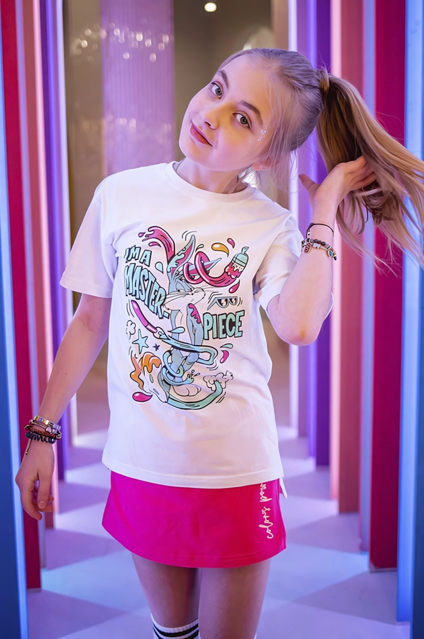 Эта яркая модель в цвете фуксия сочетает в себе лёгкость хлопка и эластичность эластана, обеспечивая максимальный комфорт и полную свободу движений во время игр, прогулок и школьных занятий.