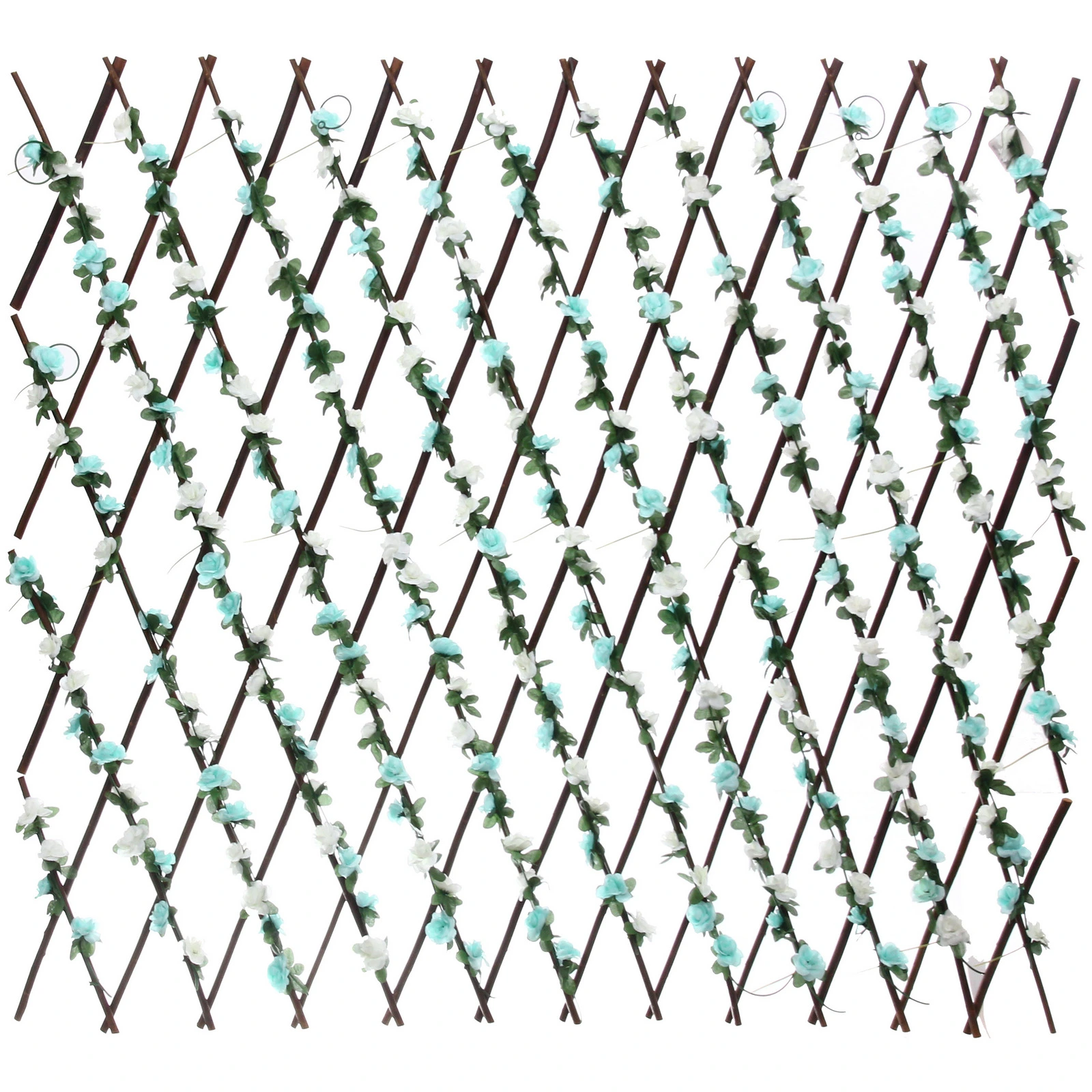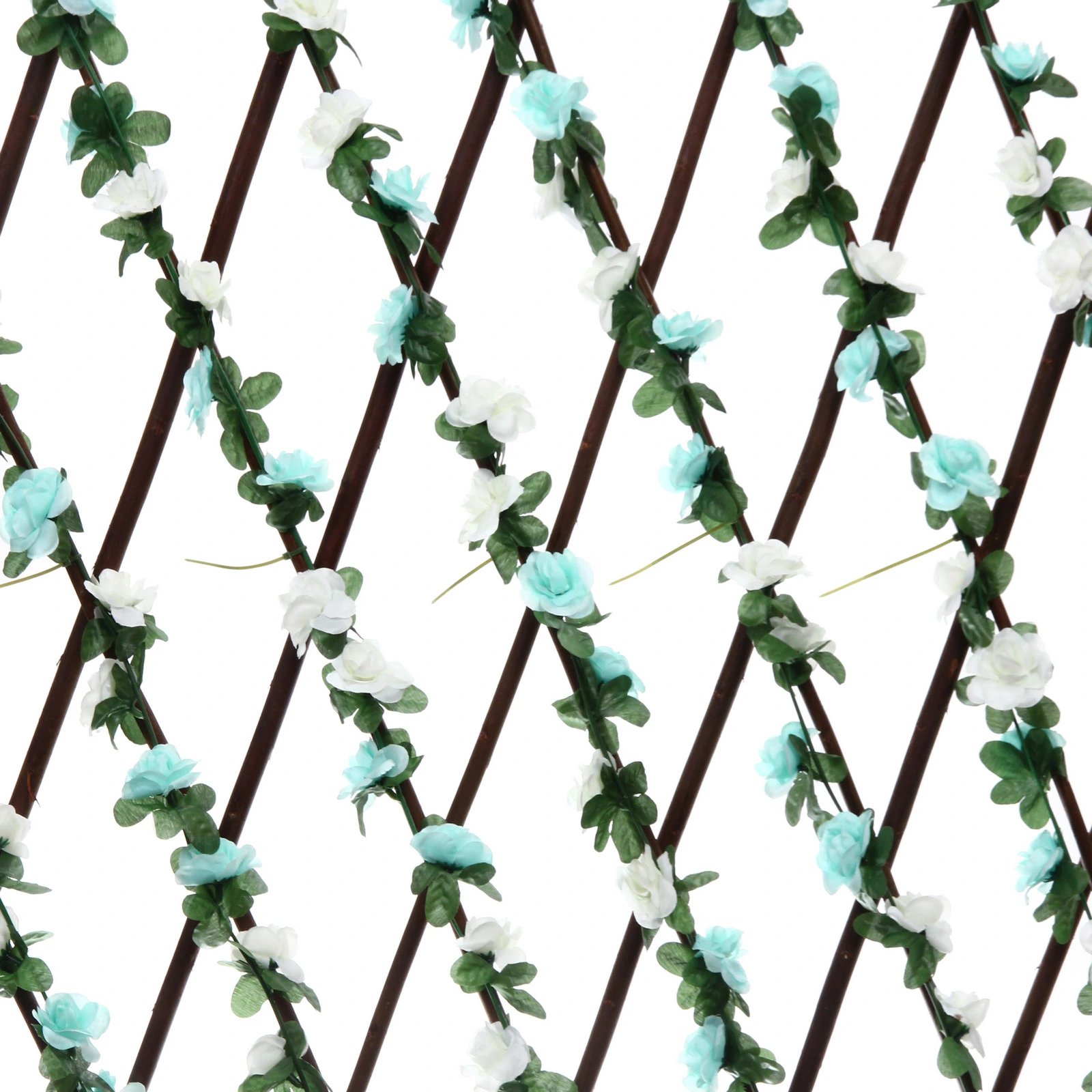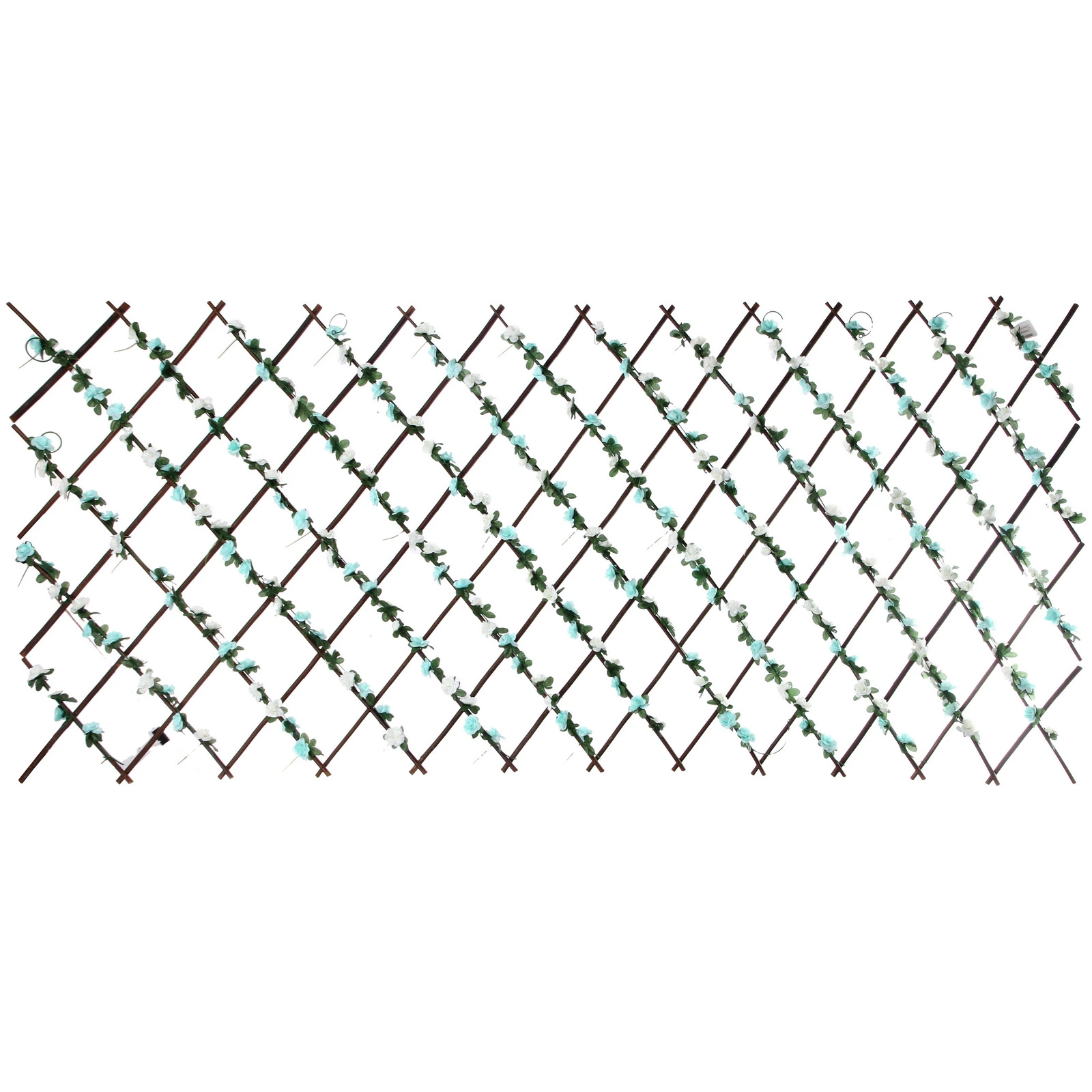 Основание выполнено в виде классической ромбовидной решетки темно-коричневого цвета. Конструкция декорирована реалистичными зелеными листьями и нежными искусственными цветами белого и светло-бирюзового оттенков. Такой разноцветный принт придает изгороди свежий и нарядный вид, превращая обычное ограждение в стильный элемент ландшафтного дизайна или интерьерную фотозону.