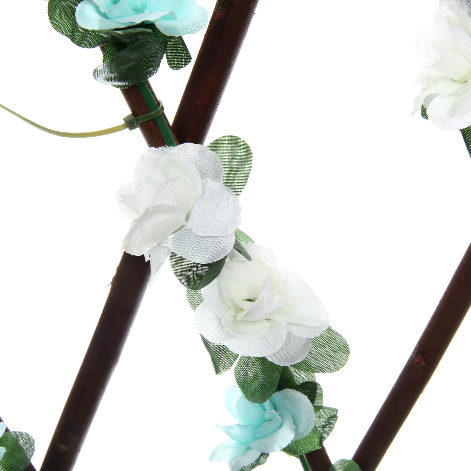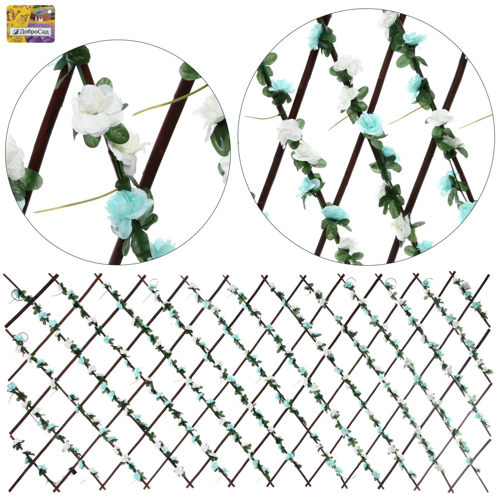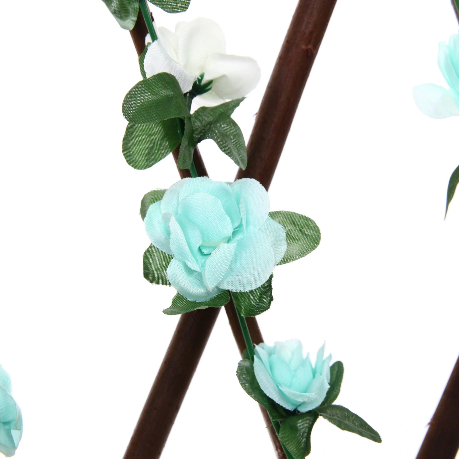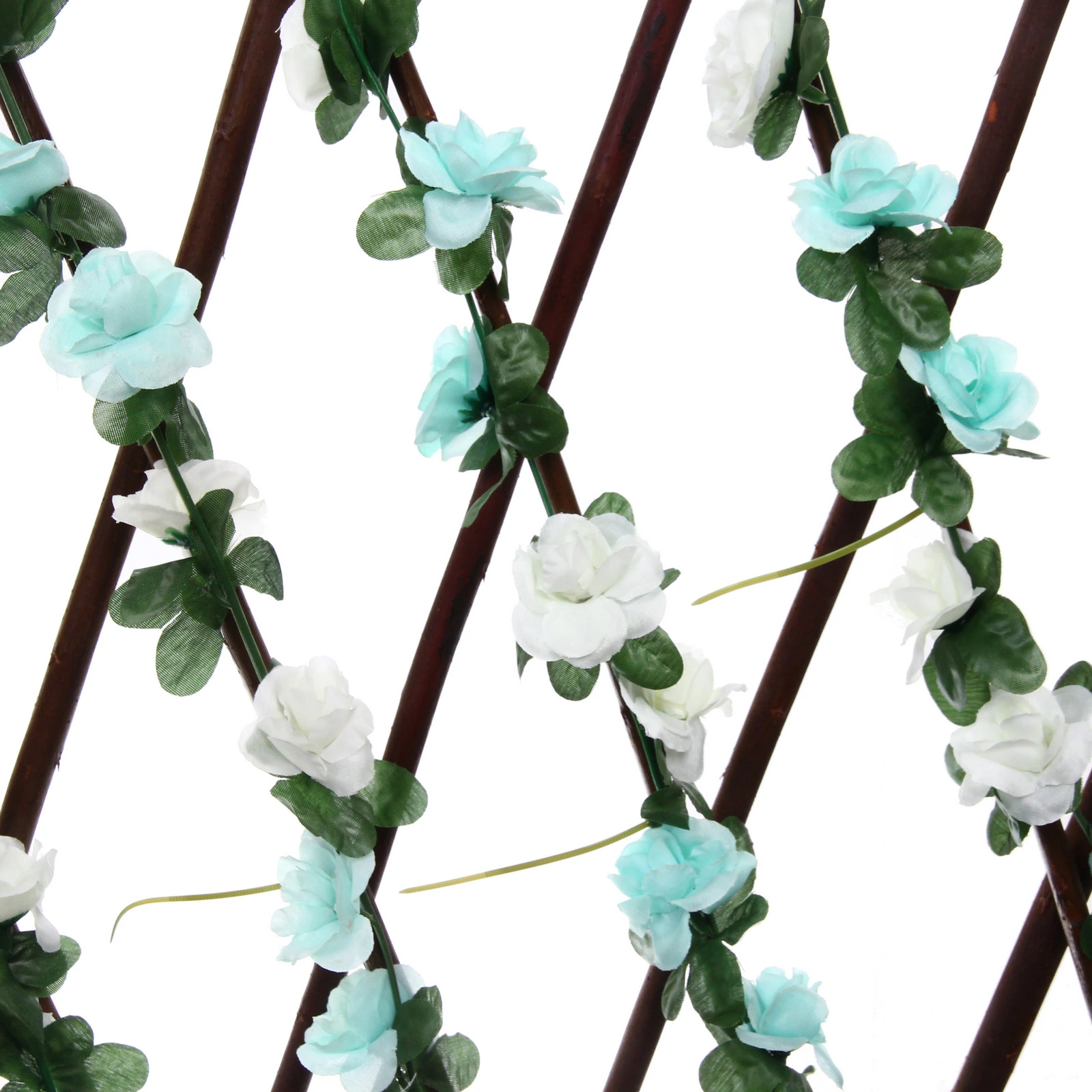 Основание выполнено в виде классической ромбовидной решетки темно-коричневого цвета. Конструкция декорирована реалистичными зелеными листьями и нежными искусственными цветами белого и светло-бирюзового оттенков. Такой разноцветный принт придает изгороди свежий и нарядный вид, превращая обычное ограждение в стильный элемент ландшафтного дизайна или интерьерную фотозону.