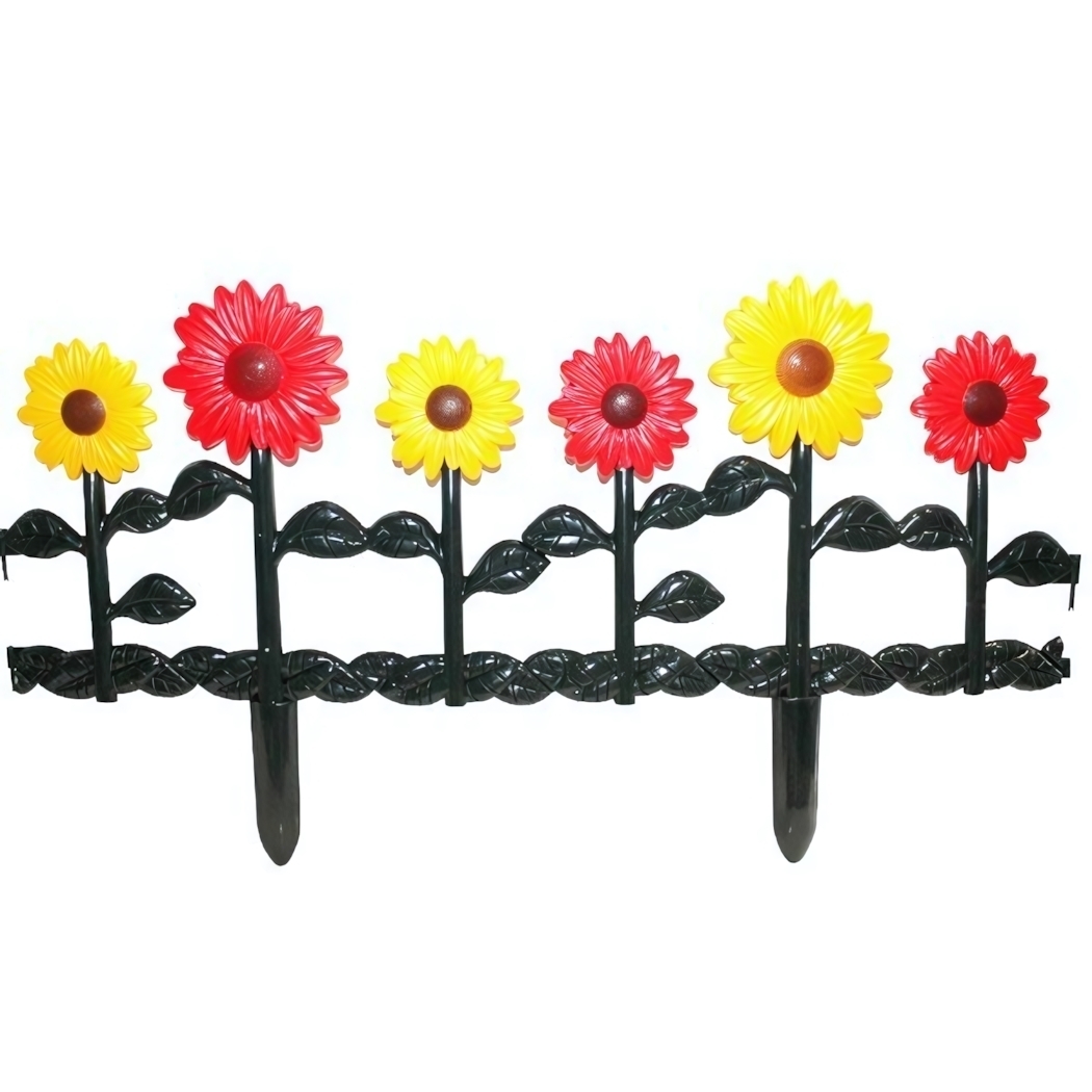 Размер секции составляет 62х33,5 см, что позволяет легко интегрировать заборчик в любой ландшафт. Цветы выполнены в ярких оттенках, что делает их заметными и привлекательными. Заборчик состоит из шести элементов, что позволяет создать длину около 90-100 см. При правильной эксплуатации срок службы изделия не ограничен, что делает его отличным выбором для вашего сада.