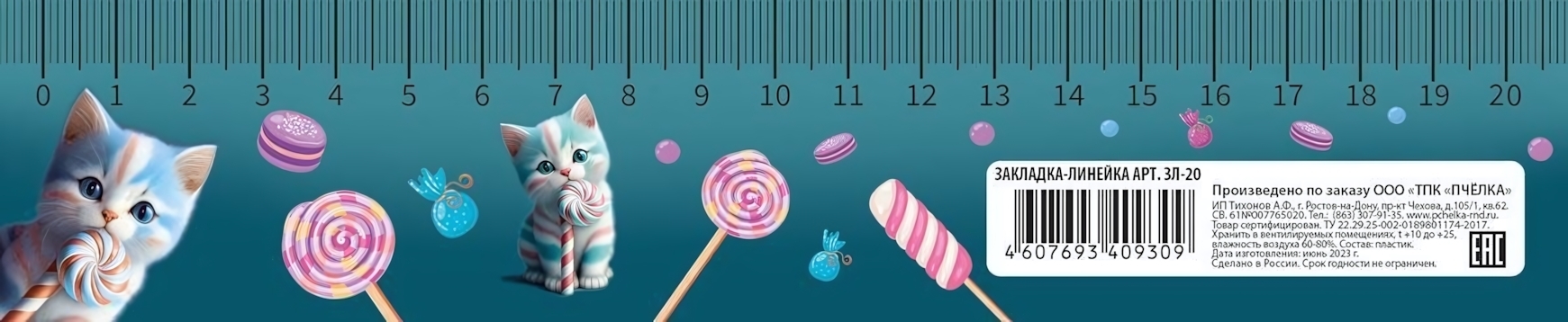 Закладка-линейка 20см 'Candy cat 2024', яркий дизайн с кошкой и конфетами