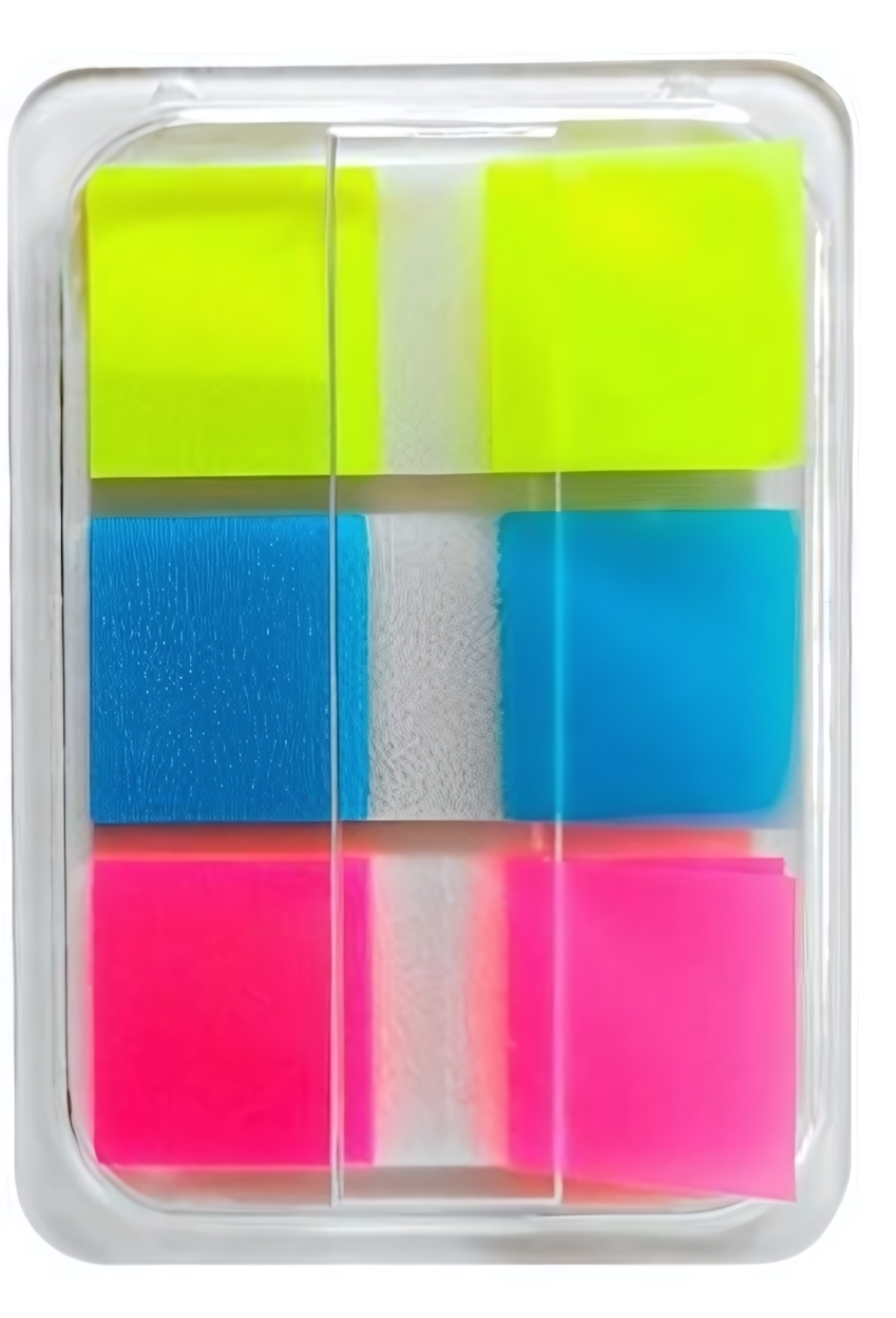 - Многоразовое использование: Уникальный адгезивный состав позволяет многократно переклеивать закладки, не оставляя следов на поверхности.