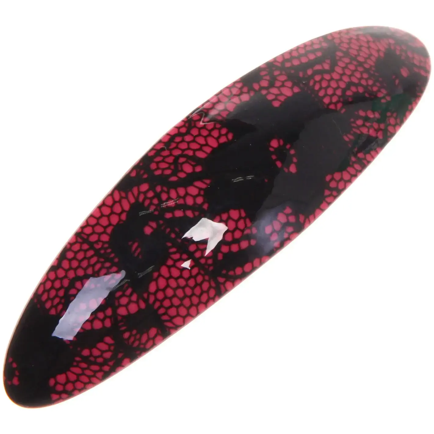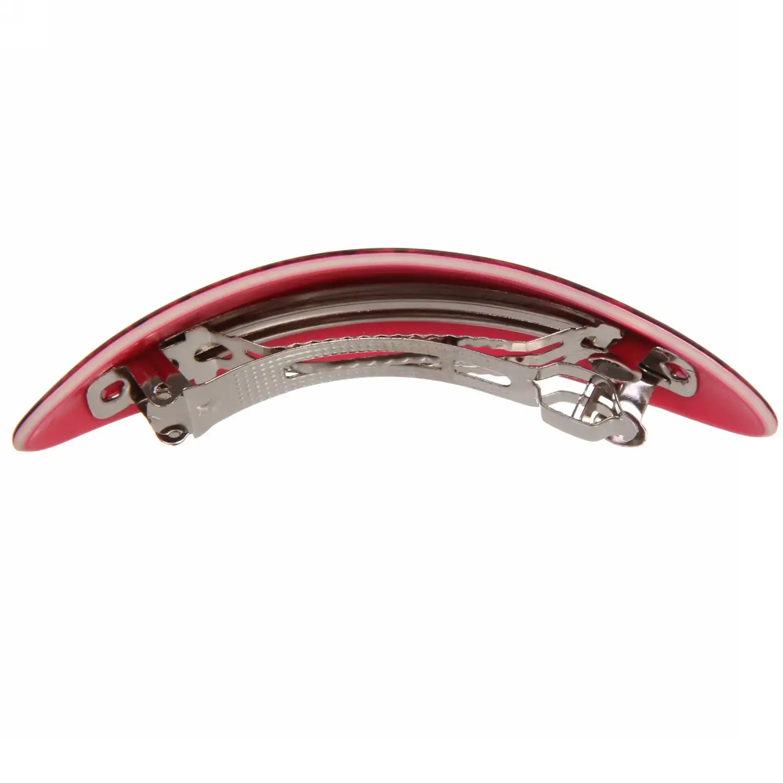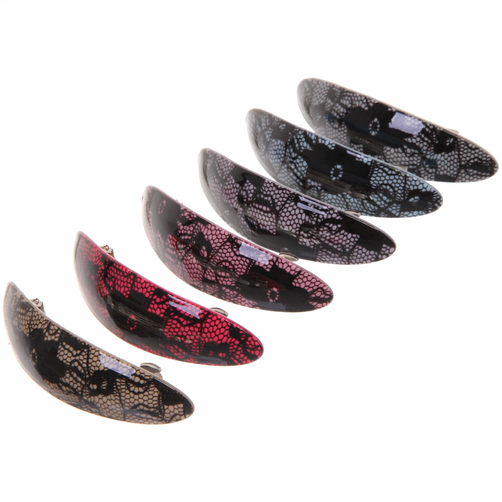 Заколка имеет овальную форму и представлена в шести различных цветах: черном, красном, фиолетовом, сером, светло-голубом и розовом. Она идеально подходит для повседневного использования, а также для создания вечерних причесок. Механизм фиксации позволяет быстро и удобно зафиксировать волосы, не повреждая их.