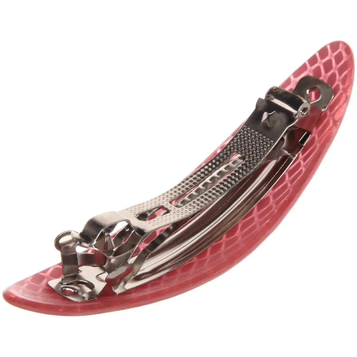 Размер заколки составляет 10х2,5 см, что делает её достаточно крупной для удержания волос. Изготовлена из качественных материалов: металл и пластик, что обеспечивает долговечность и надежность в использовании. Заколка доступна в шести цветах: бордовый, розовый, светло-розовый, серый, темно-серый и коричневый, что позволяет выбрать идеальный вариант для любого случая.