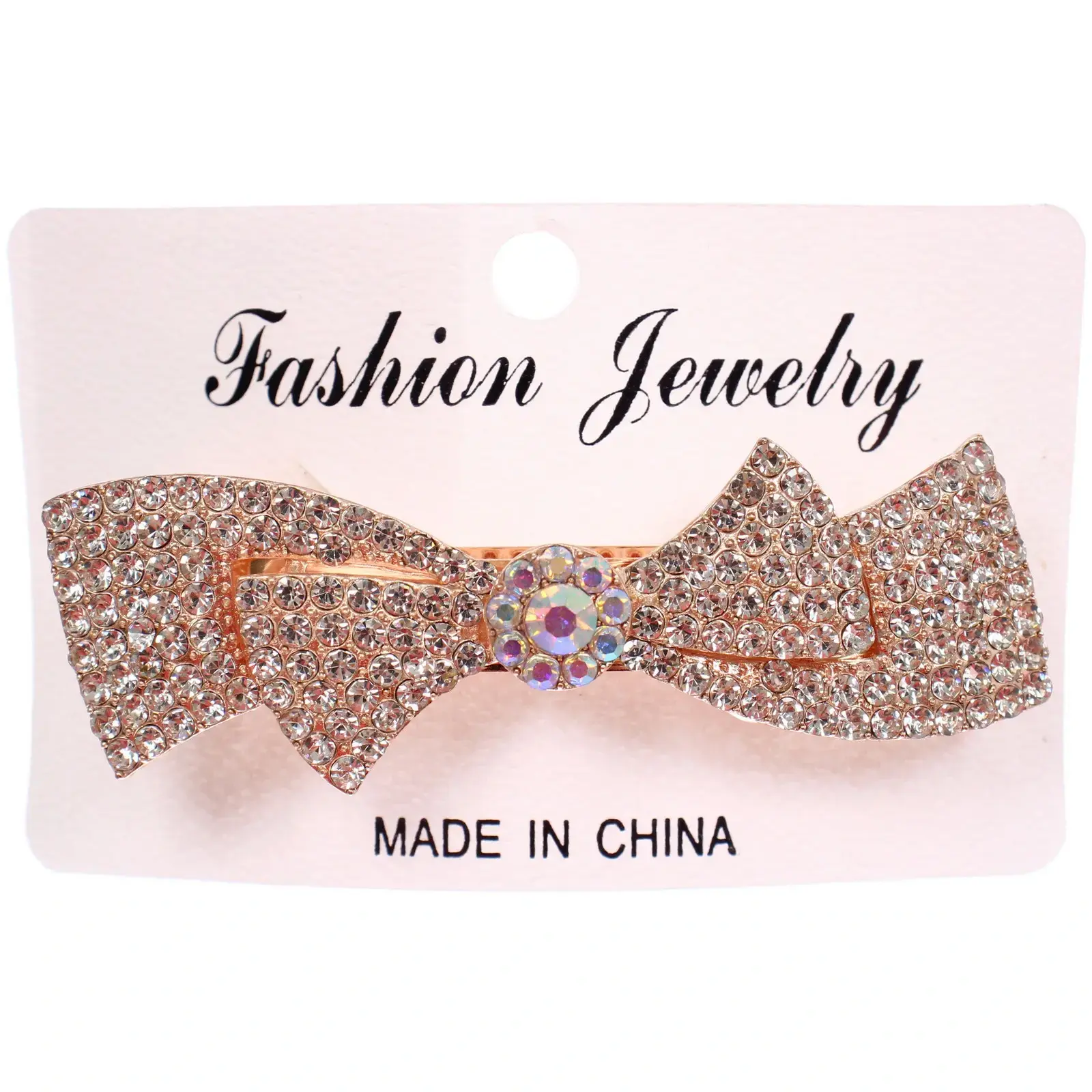 Заколка выполнена в розовом цвете с золотистым блеском, что делает её универсальным аксессуаром для любого наряда. Центральный элемент в виде круглого камня, окружённого мелкими стразами, добавляет изюминку и делает заколку по-настоящему уникальной. Упаковка заколки имеет прямоугольную форму с отверстиями для подвешивания, что удобно для хранения и демонстрации на витринах.