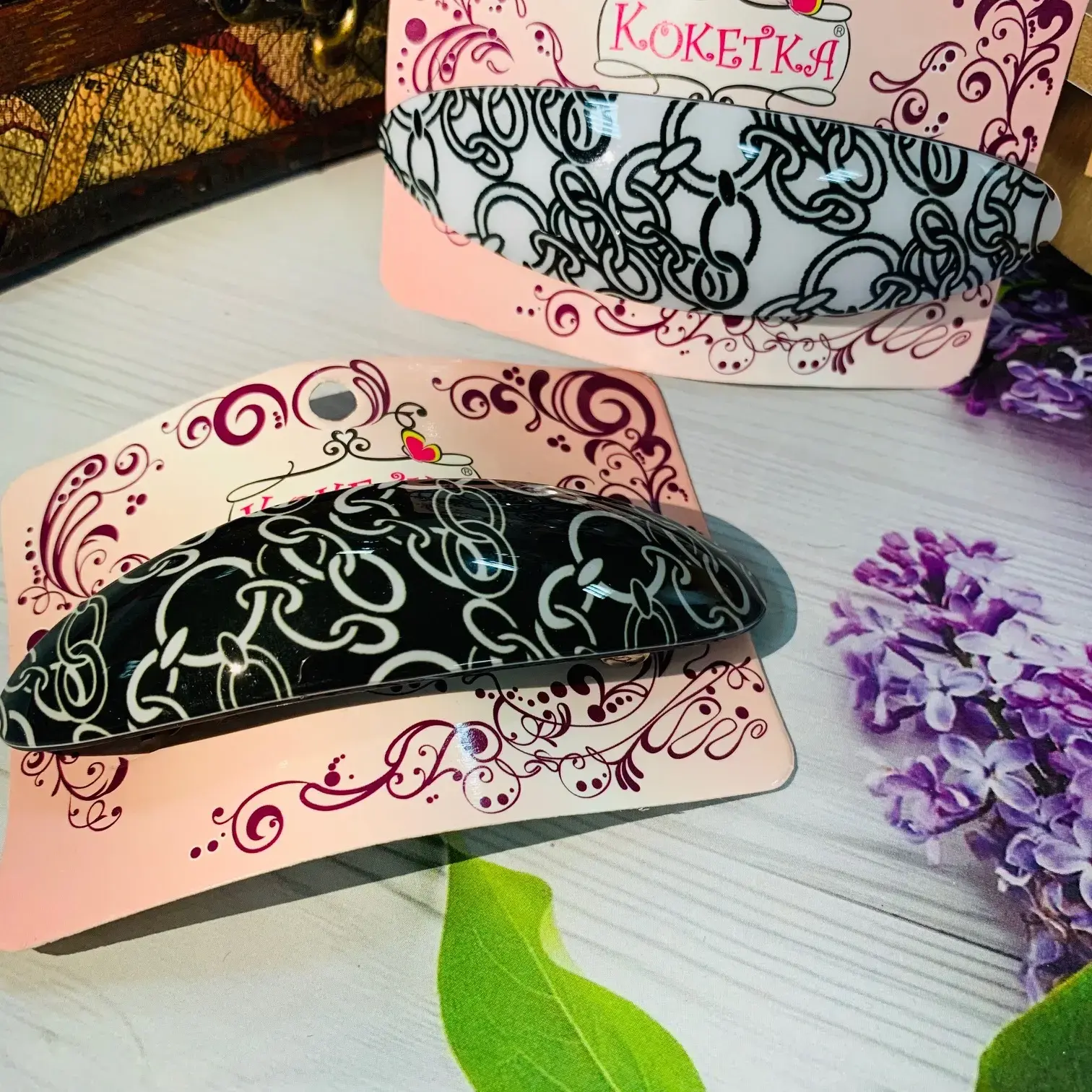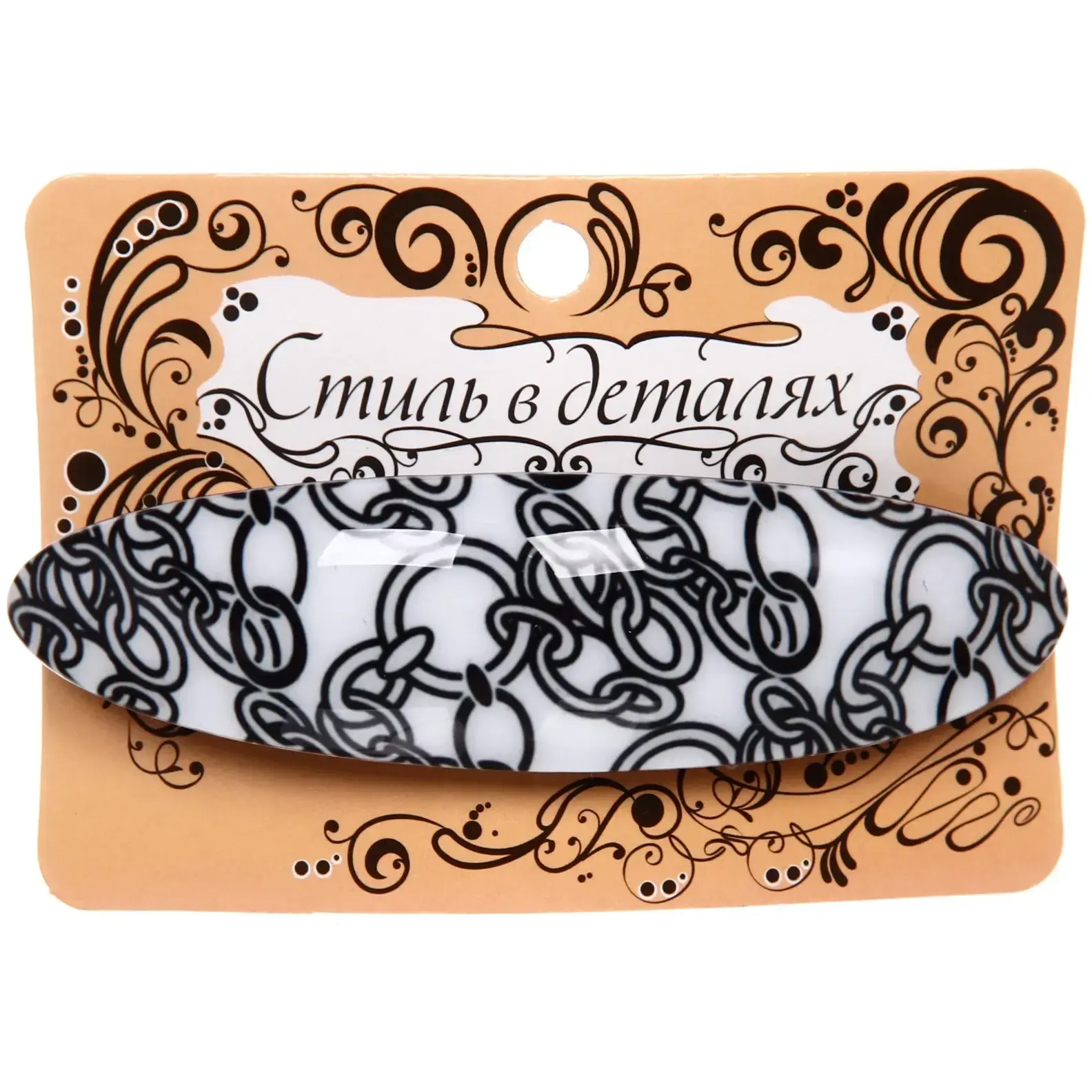 Заколка представлена в двух цветовых вариантах (черно-белый микс), что позволяет подобрать оптимальное решение под любой наряд. Материалы (металл и пластик) обеспечивают легкость и прочность изделия при ежедневном использовании.