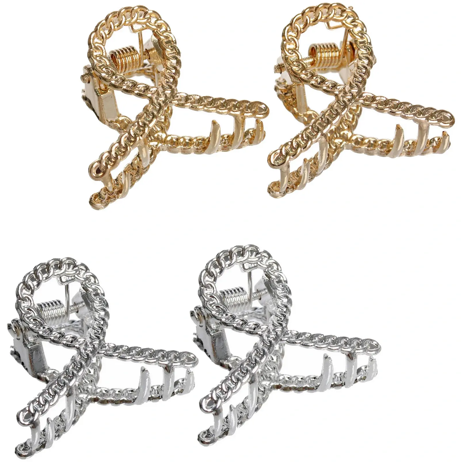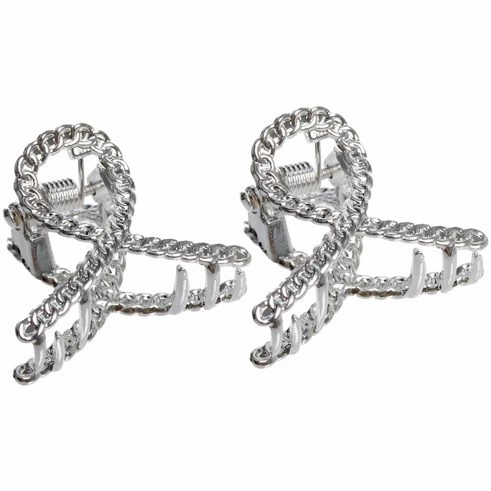 В набор входят две заколки размером 2.8*2.2см из качественного металла с эффектными завитками. Комбинация золотого и хромированного цветов позволяет подобрать аксессуар под любой образ и наряд.