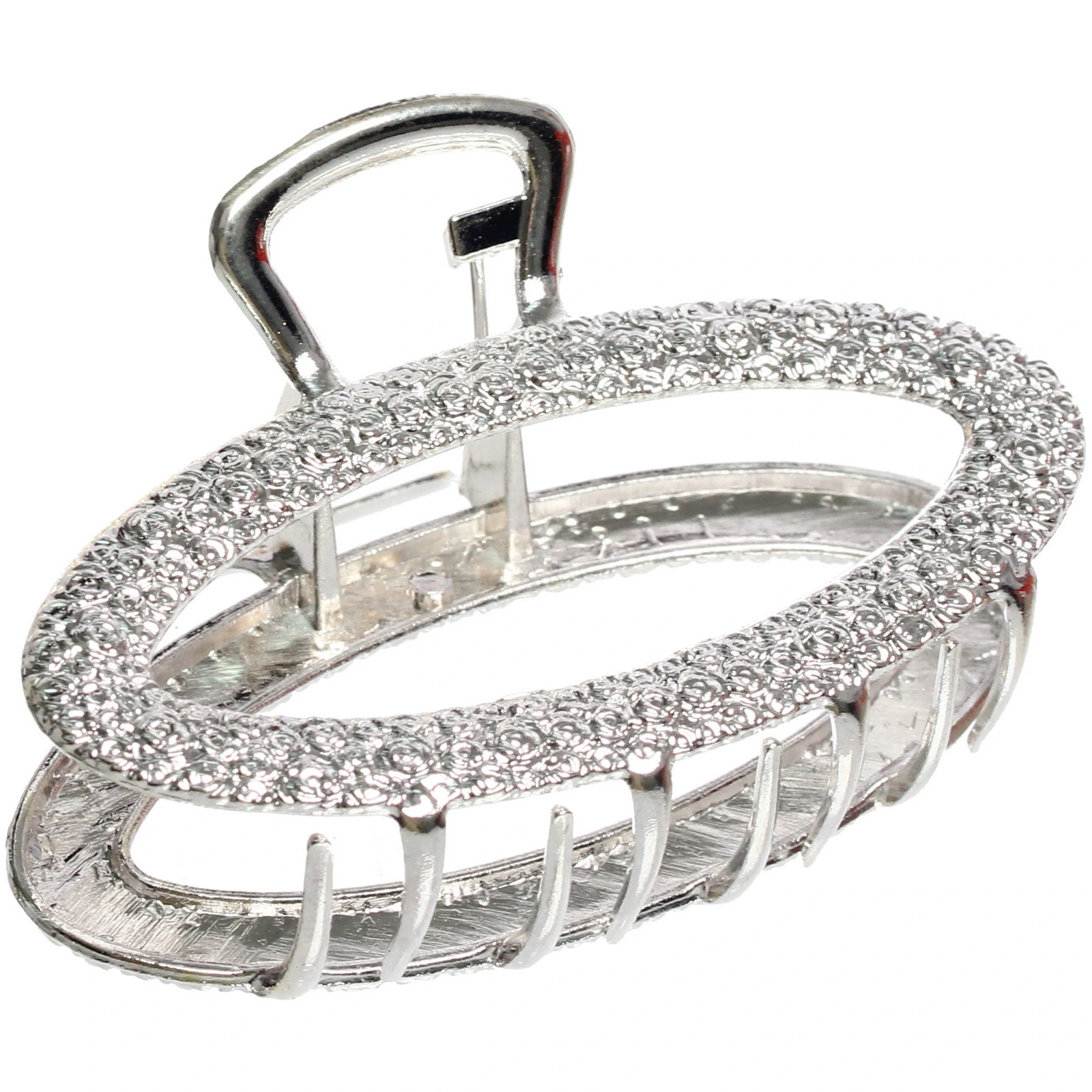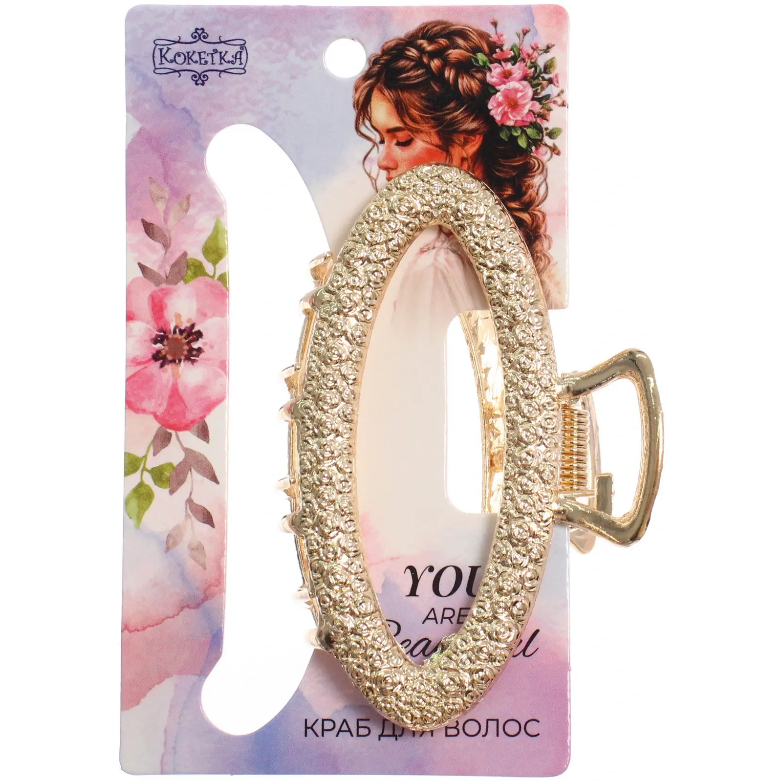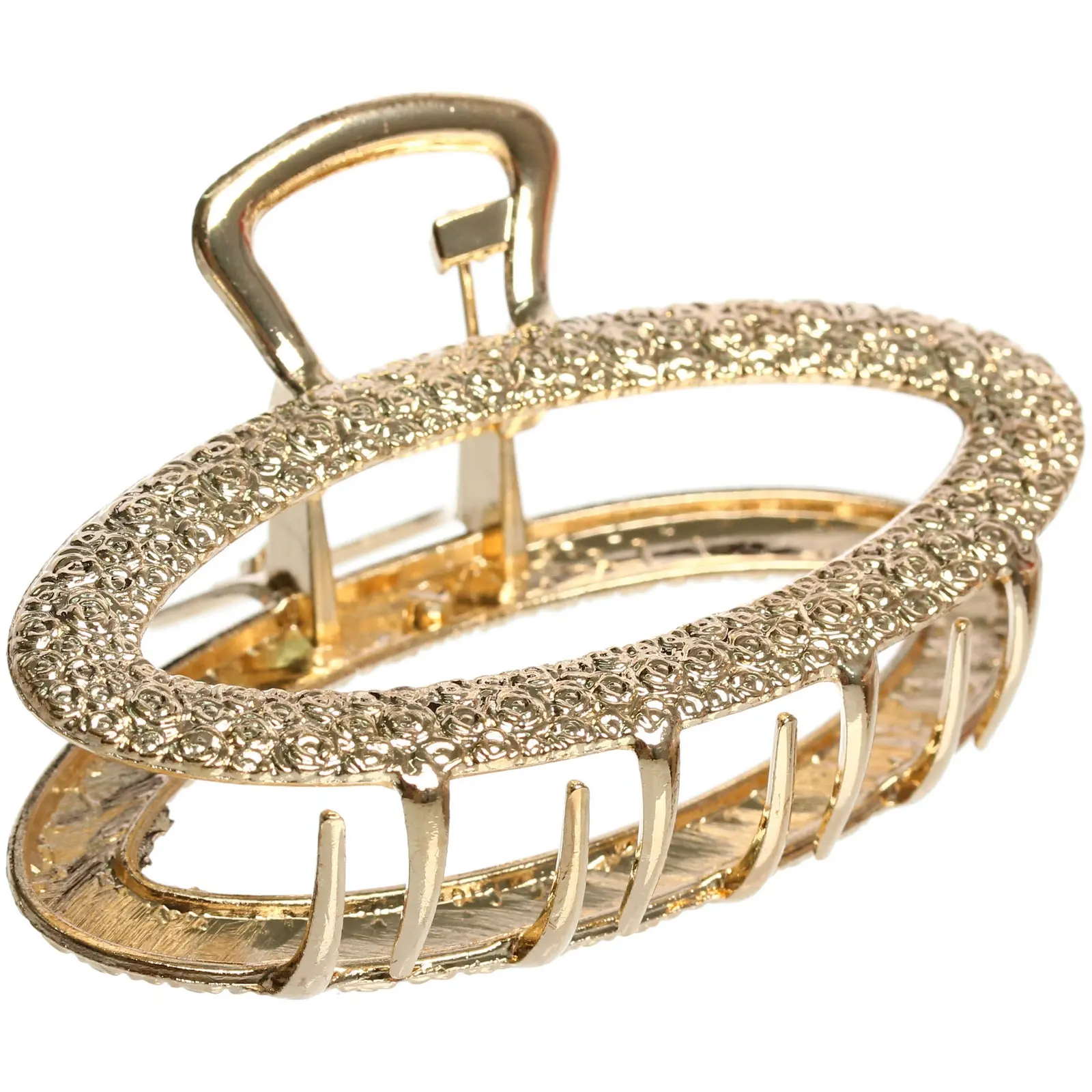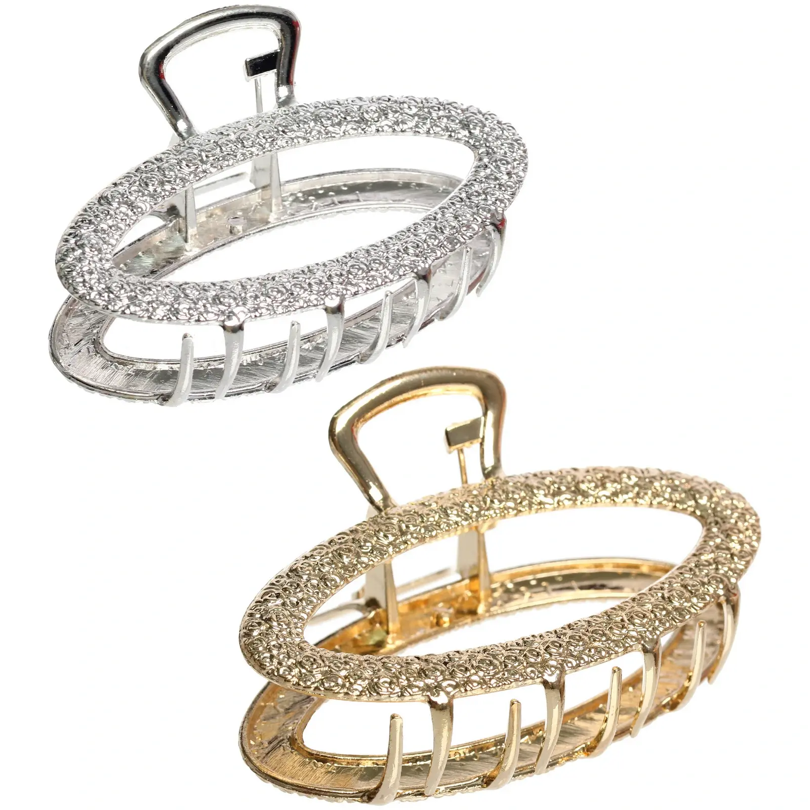 Заколка выполнена из высококачественного металла с роскошным золотисто-хромированным покрытием. Овальная форма и декоративный узор создают изысканный вид, делая аксессуар не просто функциональным, но и стильным дополнением вашей прически.