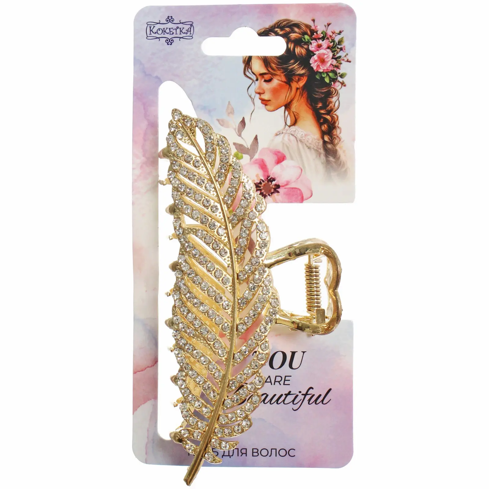 Заколка представлена в двух элегантных цветовых решениях: золотистом и хромированном. Материал: высококачественный металл с гипоаллергенным покрытием. Стильный дизайн в форме листа с декоративными изгибами делает аксессуар универсальным выбором для повседневной носки и особых случаев.