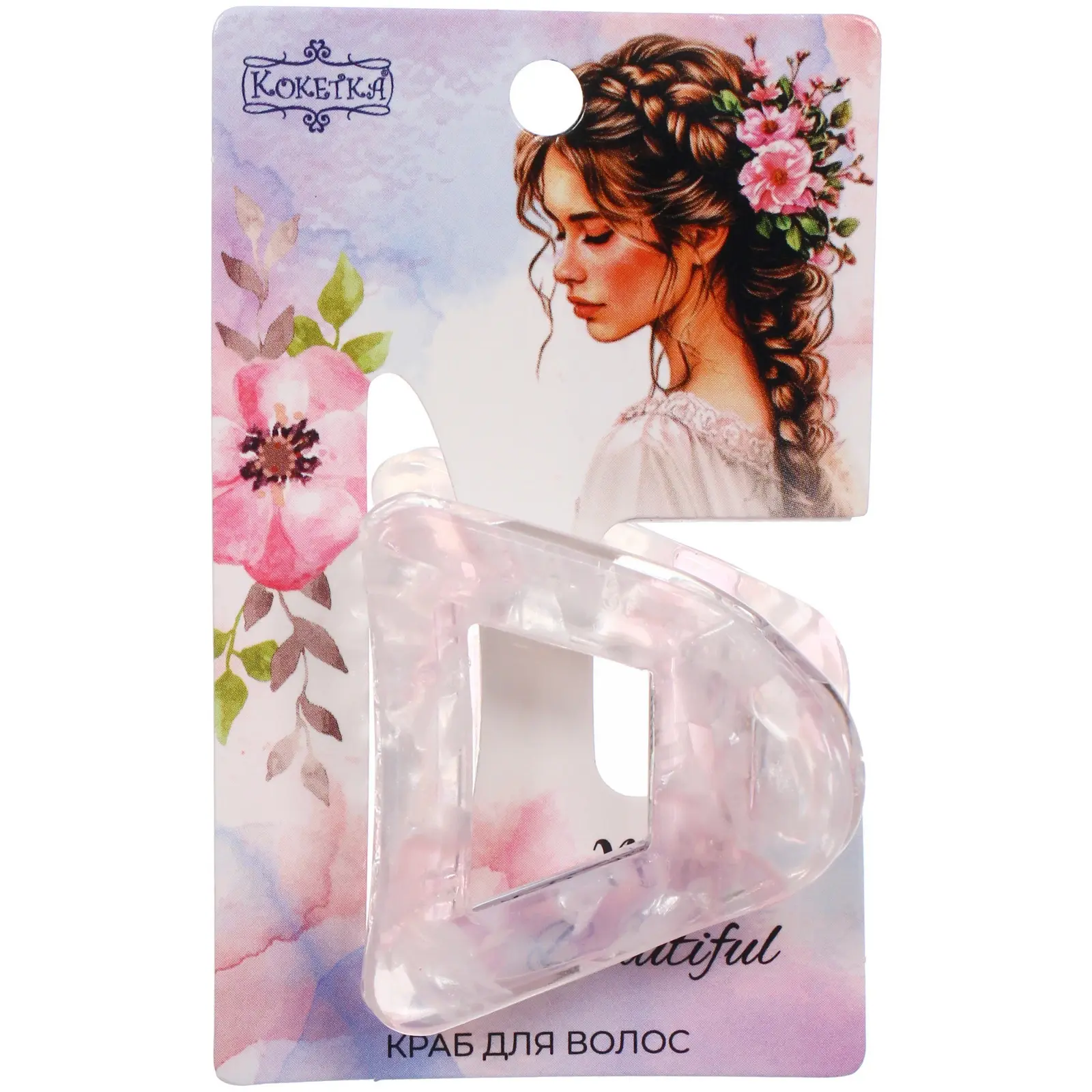 Материал — пластик с прозрачной и цветной частью, поверхность — глянцевая, цвет — многоцветный с мраморным эффектом, дизайн — треугольный с зубчатой фиксацией, подходит для использования с разными типами волос.