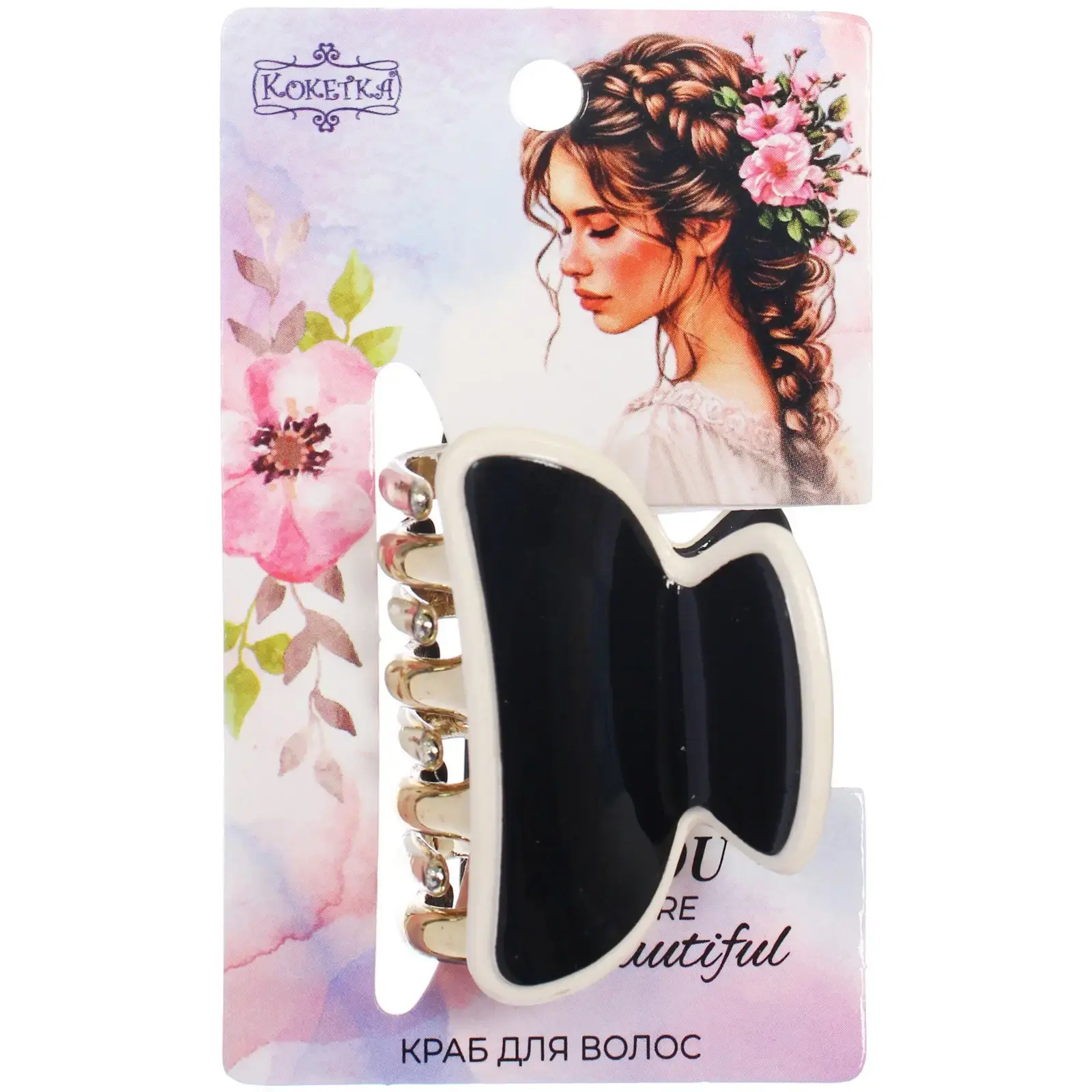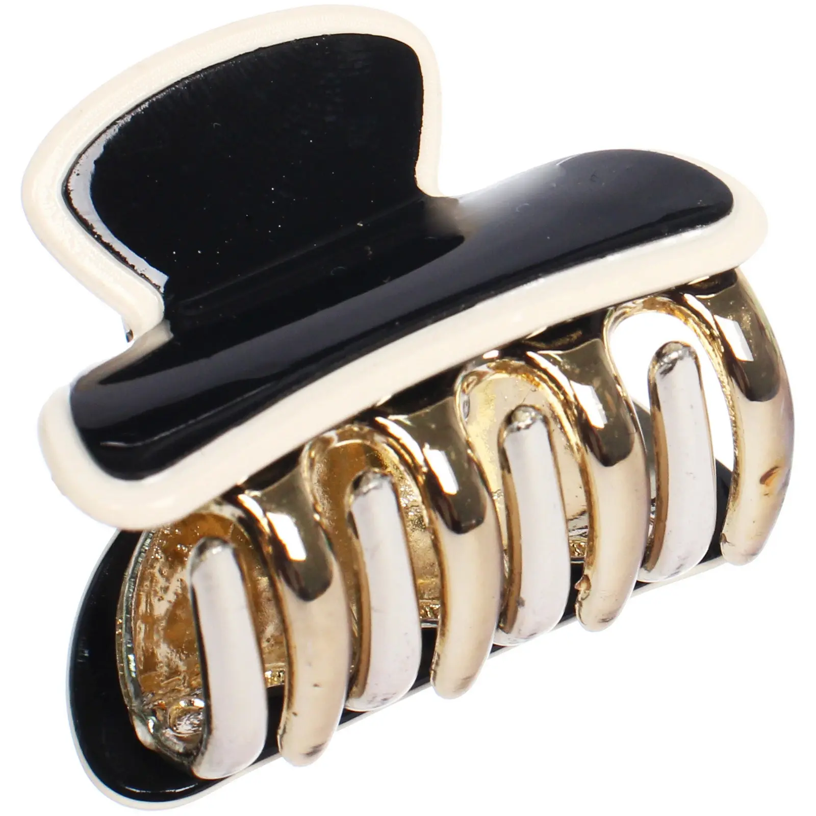 Корпус выполнен из гладкого пластика, зубцы — из прочного металла с золотистым и серебристым покрытием. Пружинный механизм обеспечивает плотное прилегание и комфорт при носке. Цвет — черный с белой окантовкой, отгружается один товар.