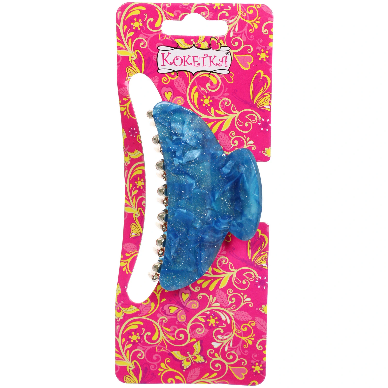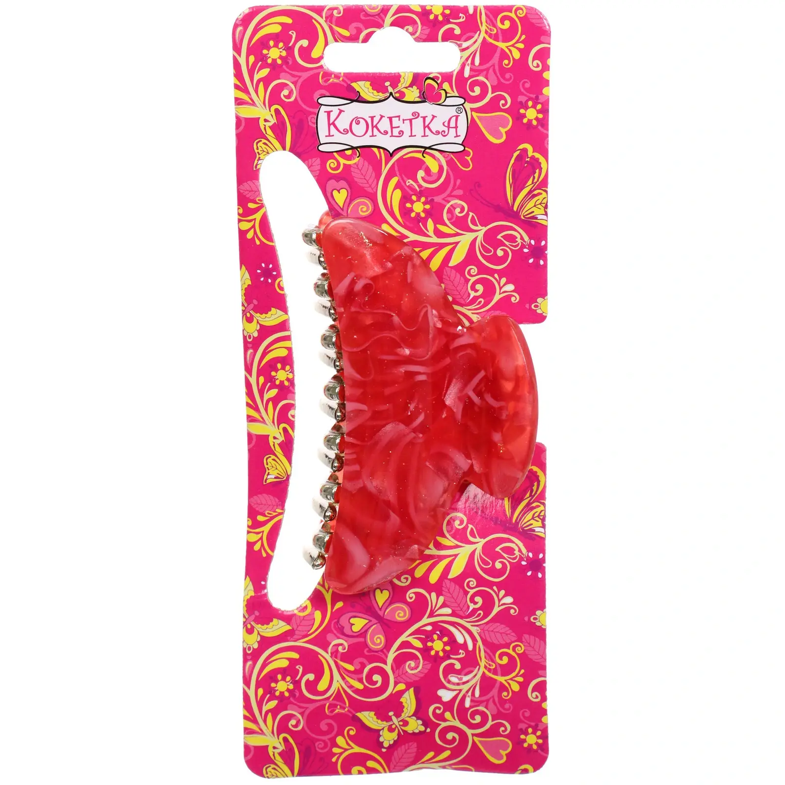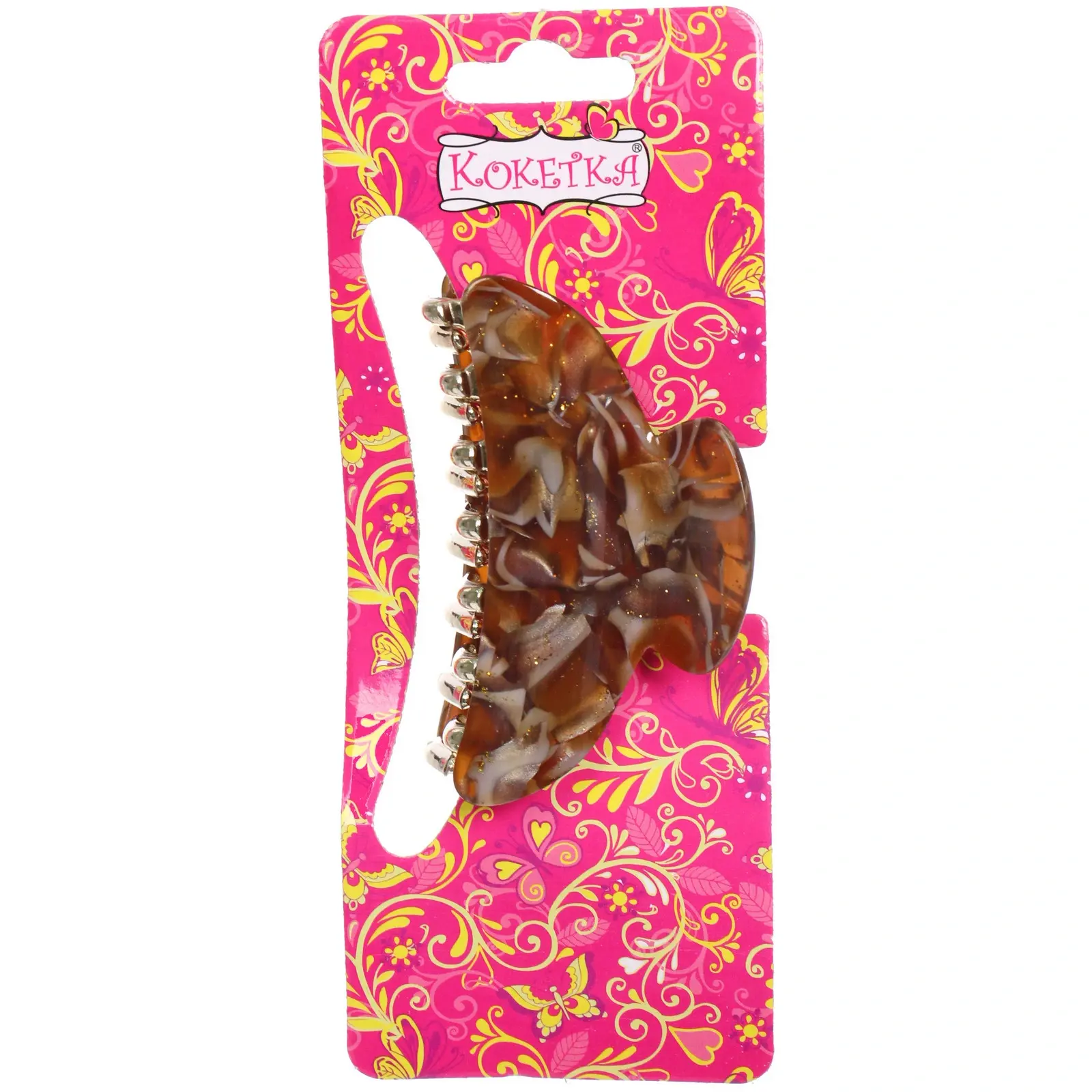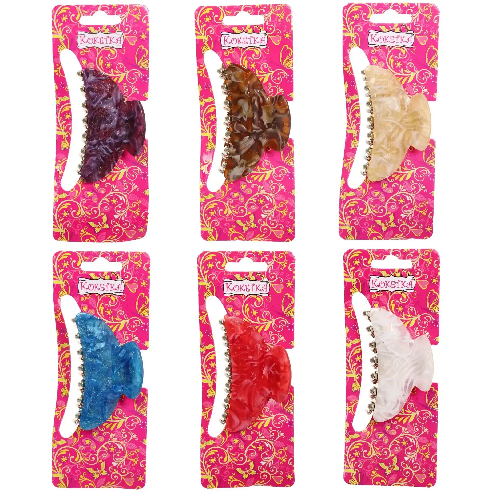 Заколка выполнена из качественных материалов: прочного пластика и металла, что гарантирует долговечность и надежность. Полупрозрачные цвета с характерными узорами добавляют изюминку и делают заколку стильным аксессуаром. Удобная форма с закругленными краями обеспечивает комфортное ношение, не травмируя кожу головы.