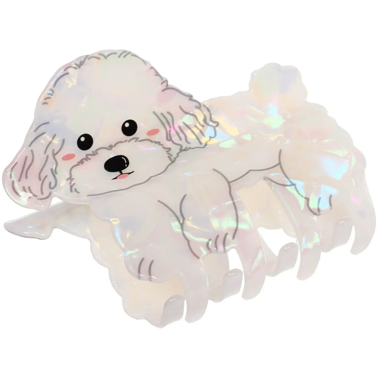 Эта изящная заколка-краб в форме милого белого щенка с перламутровым блеском станет ярким акцентом вашего образа и надёжным помощником в создании красивых причёсок. Лёгкая, удобная в использовании и достаточно прочная, она аккуратно фиксирует волосы, позволяя создавать как повседневные, так и праздничные укладки.
