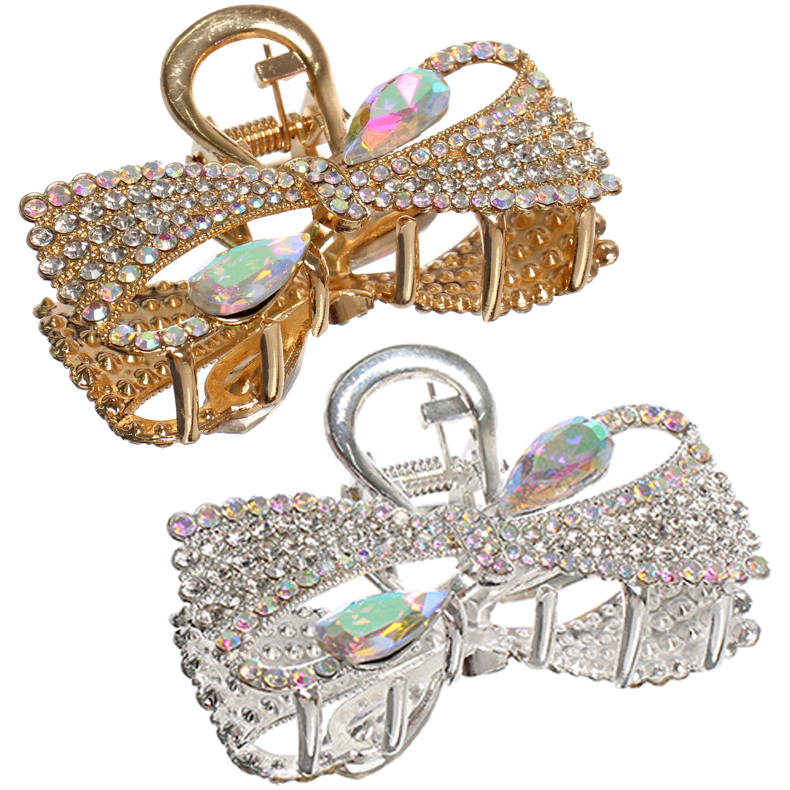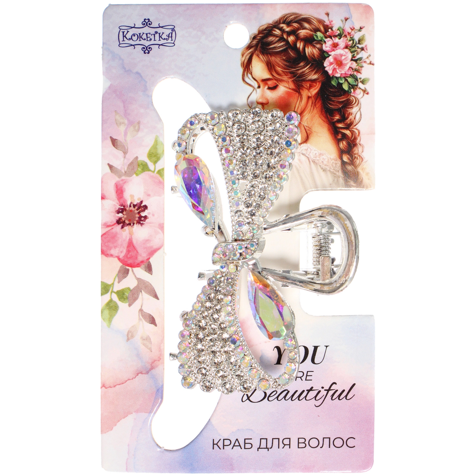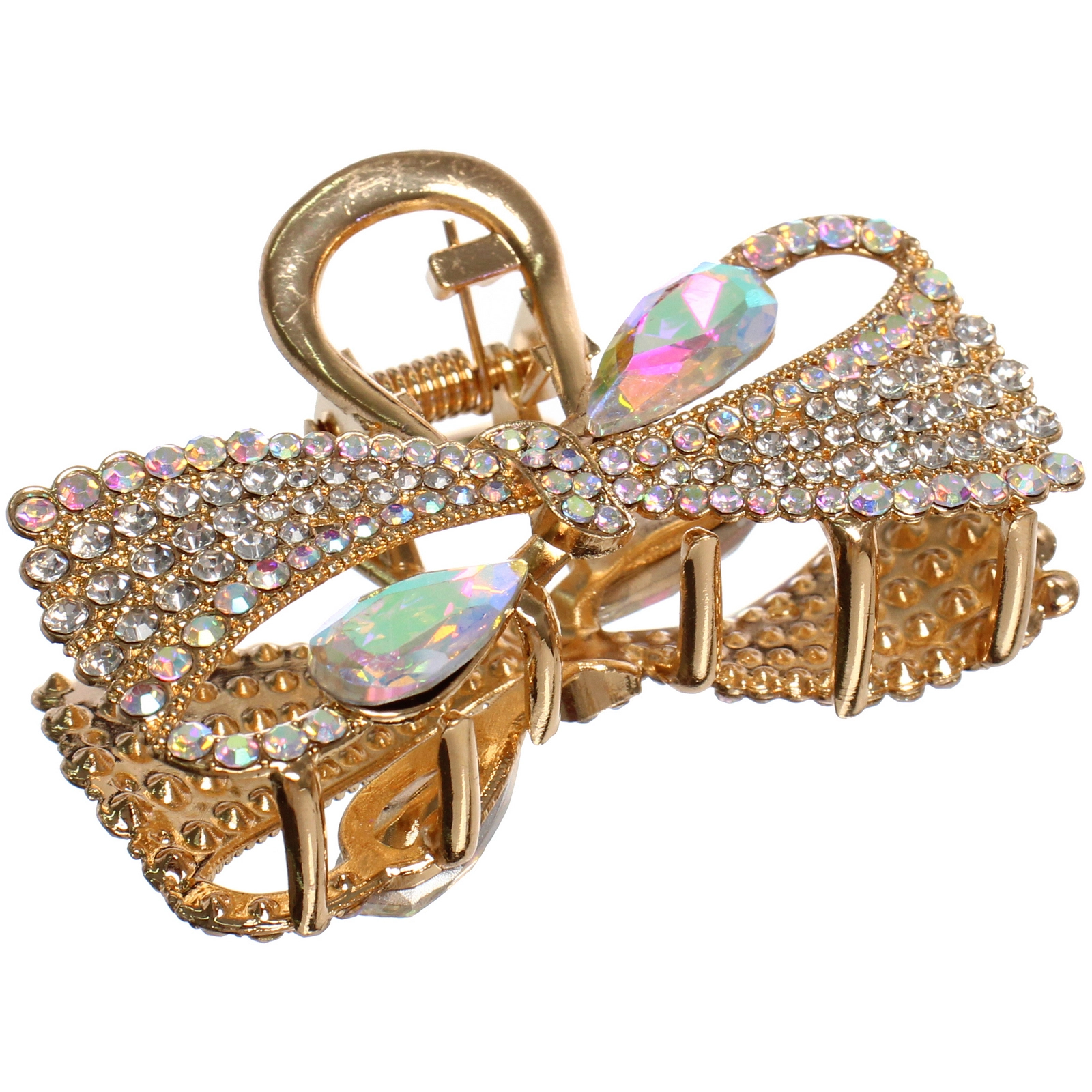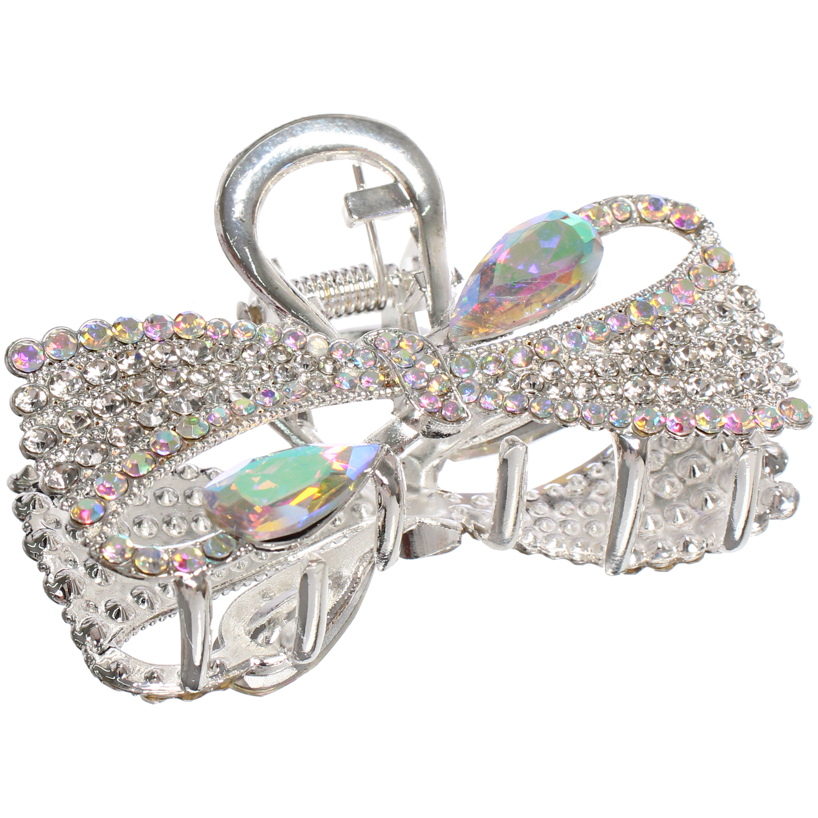 Изящная форма банта, полностью усыпанная мелкими прозрачными стразами, создает эффект сияния при любом освещении. Центральным элементом декора выступают крупные каплевидные кристаллы с радужным иридисцентным переливом, которые добавляют аксессуару особый шарм и элегантность.