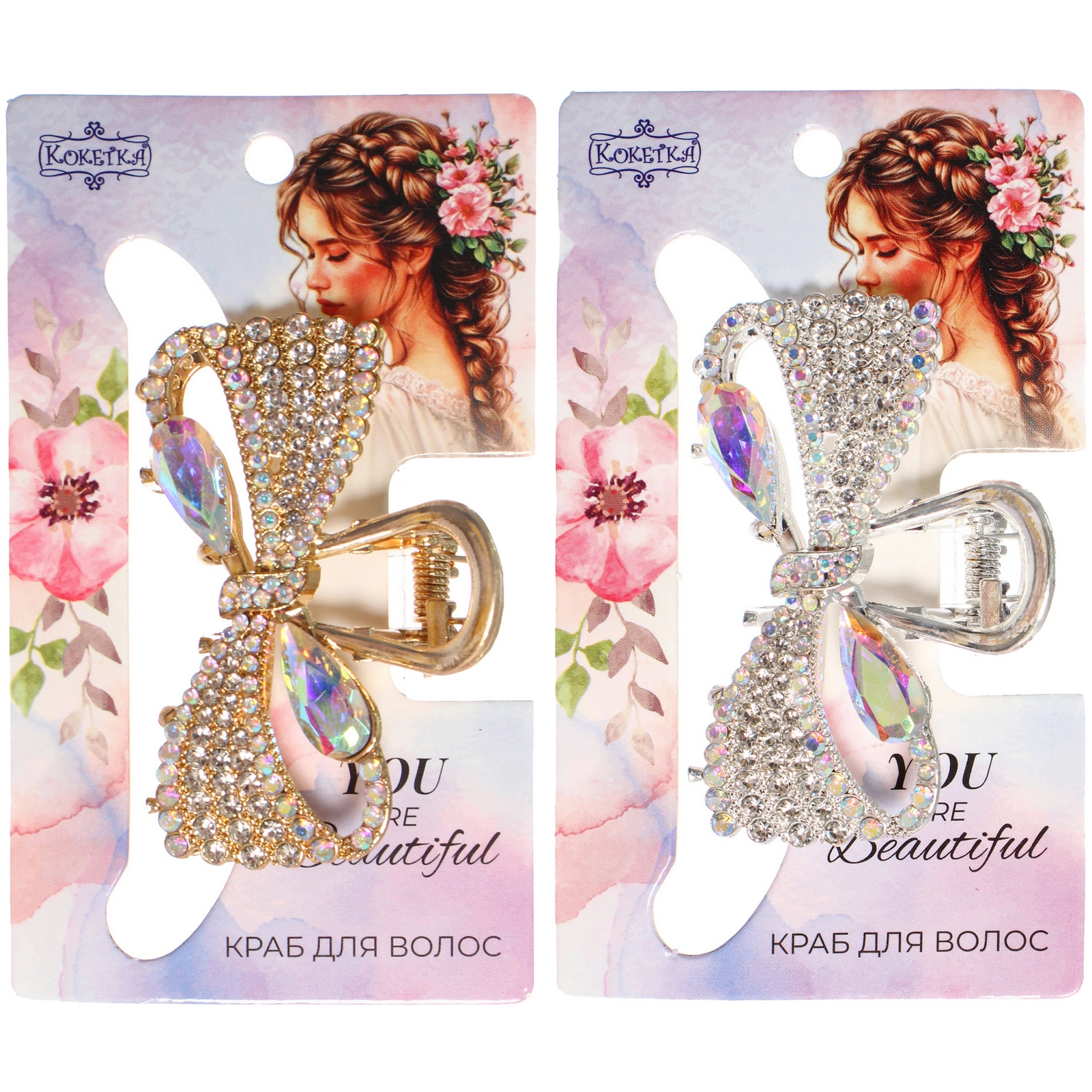 Товар представлен в двух классических цветах металлической основы: серебро и золото. Отгружается один аксессуар, цвет определяется случайным образом из доступного ассортимента. Размер заколки составляет 5.8 см в длину и 3.3 см в ширину, что делает ее достаточно компактной и в то же время заметной в прическе. Материал основы — металл, что гарантирует прочность и долгий срок службы механизма.