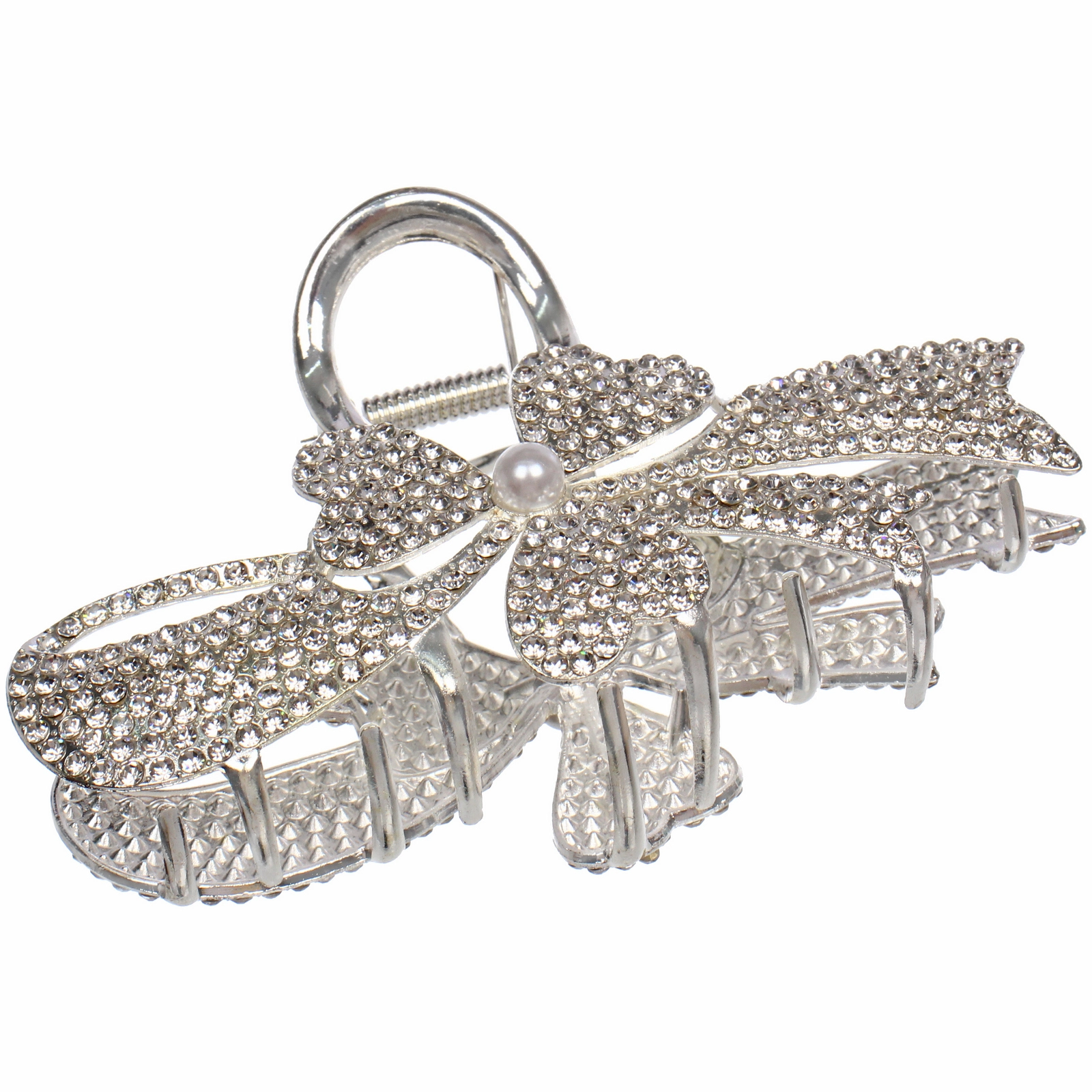 - Элегантный дизайн: Декоративный элемент в виде цветка или банта, украшенный множеством стразов и центральной жемчужиной, добавляет образу блеска и изысканности.