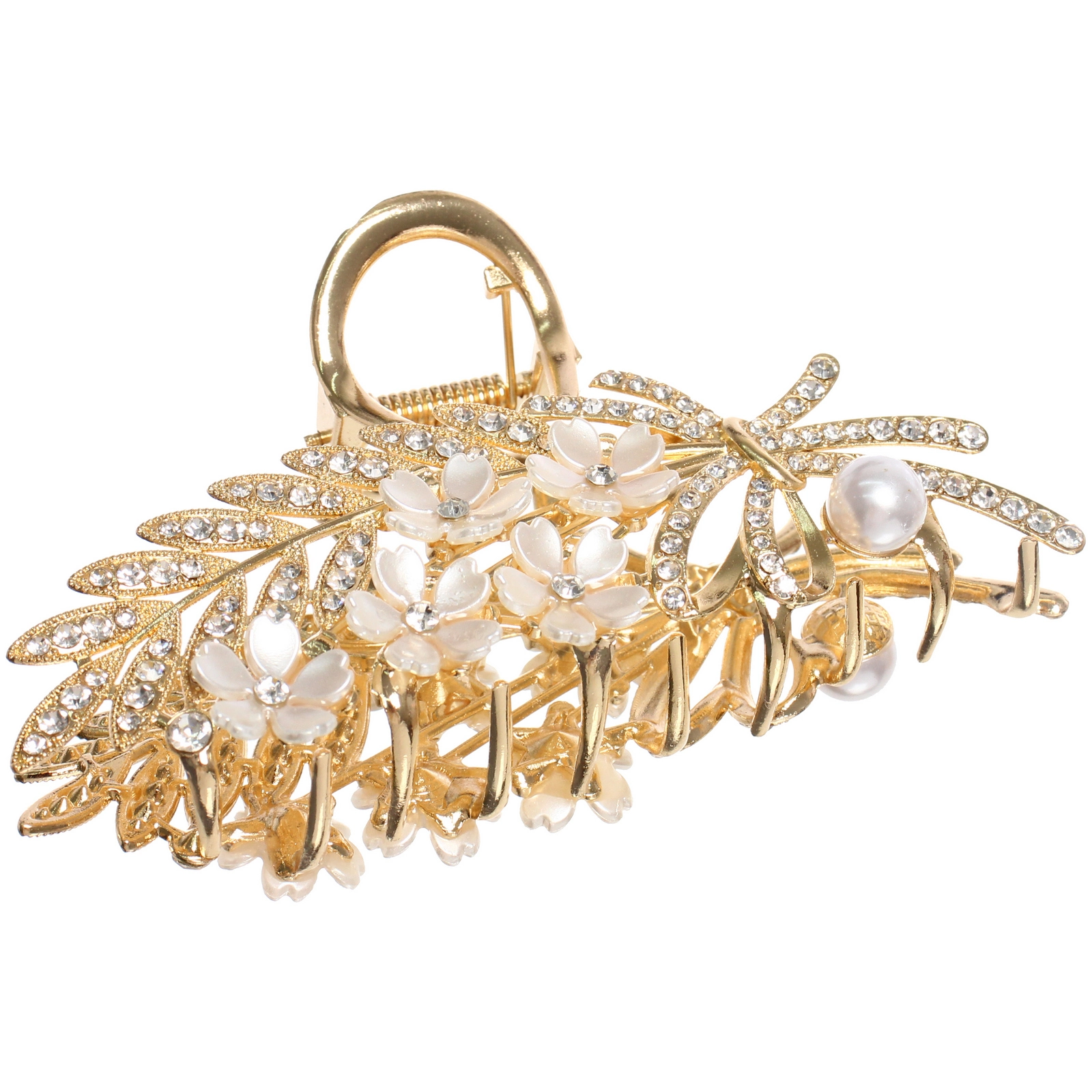 - Центральные акценты: Белые цветы с прозрачными стразами в сердцевине и крупная жемчужина завершают образ.