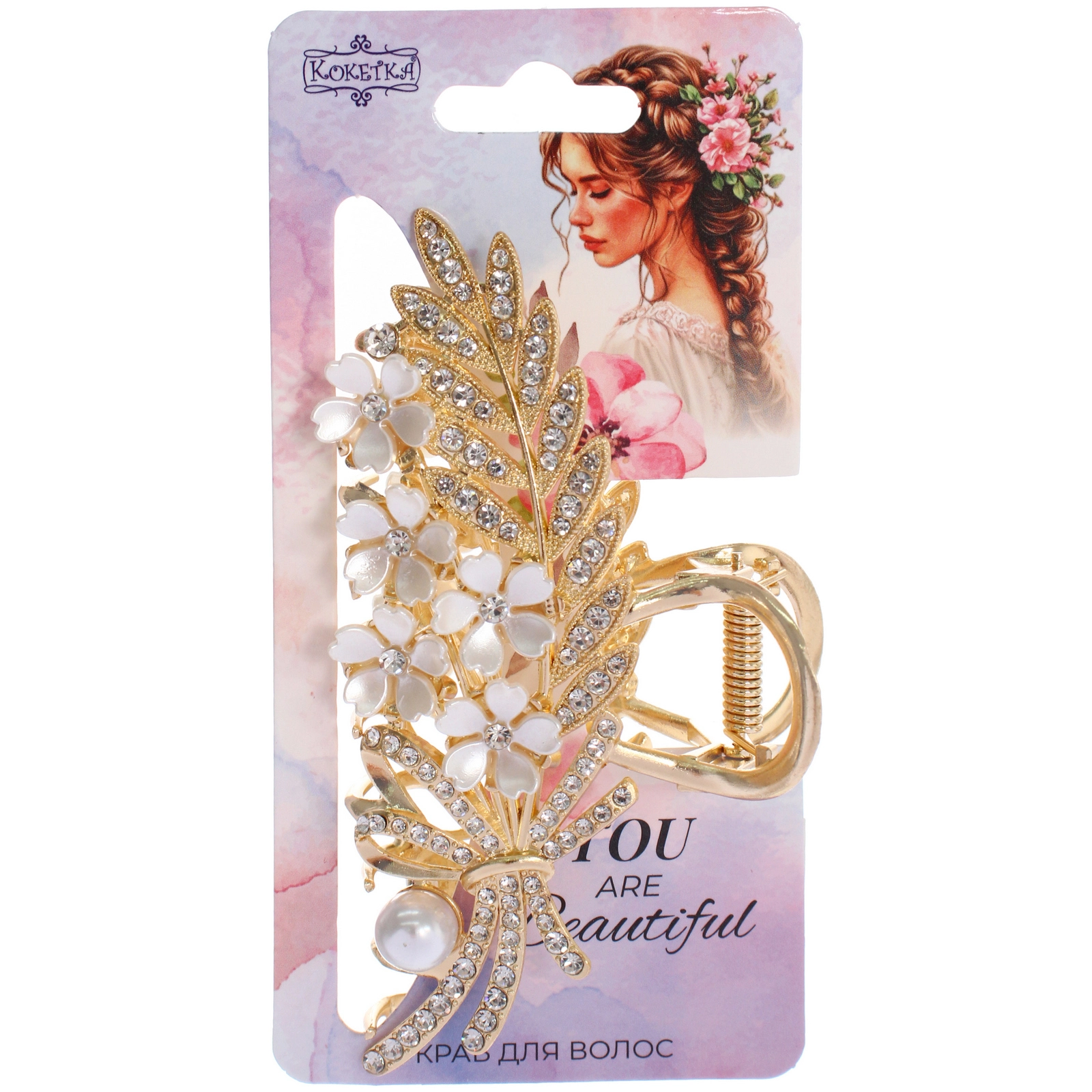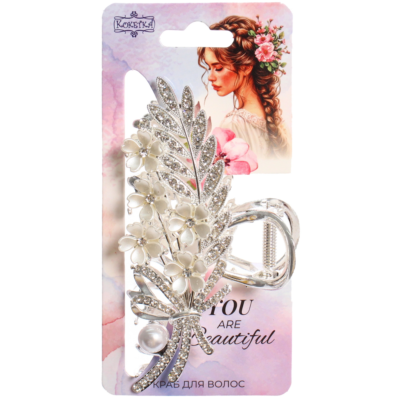 Элегантная заколка-краб «Кокетка» — это стильный аксессуар, который превратит вашу повседневную прическу в изысканную и ухоженную. Ее декоративная часть в виде цветущей веточки, украшенной стразами и жемчугом, добавит образу нотку романтики и женственности, а надежный механизм обеспечит крепкую фиксацию даже самых непослушных прядей.
